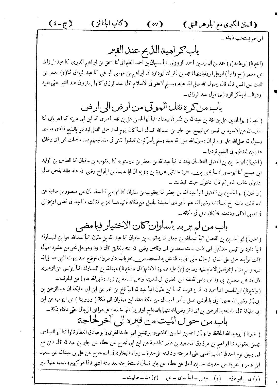 (أخبرنا) أبو حامد (1) احمد بن الوليد بن احمد الزوزني انبأ سليمان بن احمد الطبراني ثنا اسحق بن ابراهيم الدبري ثنا عبد الرزاق عن معمر (ح وانبأ) أبو علي الروذباري انا محمد بن بكر ثنا أبو داود ثنا ابراهيم بن موسى البلخي ثنا عبد الرزاق ثنا (2) معمر عن ثابت عن انس قال قال رسول الله صلى الله عليه وسلم لا عقر في الاسلام قال عبد الرزاق كانوا يعقرون عند القبر يعني بقرة أو شيئا - لم يذكر الزوزني قول عبد الرزاق