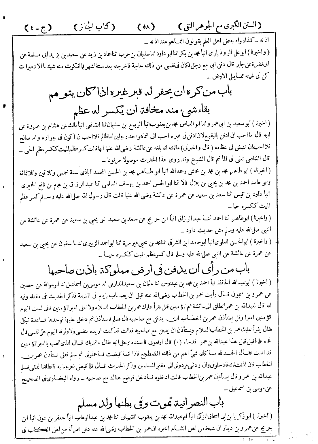 (وأخبرنا) أبو الحسن العلوي انبأ أبو حامد ابن الشرقي ثنا محمد بن يحيى غير مرة ثنا أبو احمد الزبيري ثنا سفيان عن يحيى بن سعيد عن عمرة عن عائشة عن النبي صلى الله عليه وسلم قال كسر عظم الميت ككسره حيا