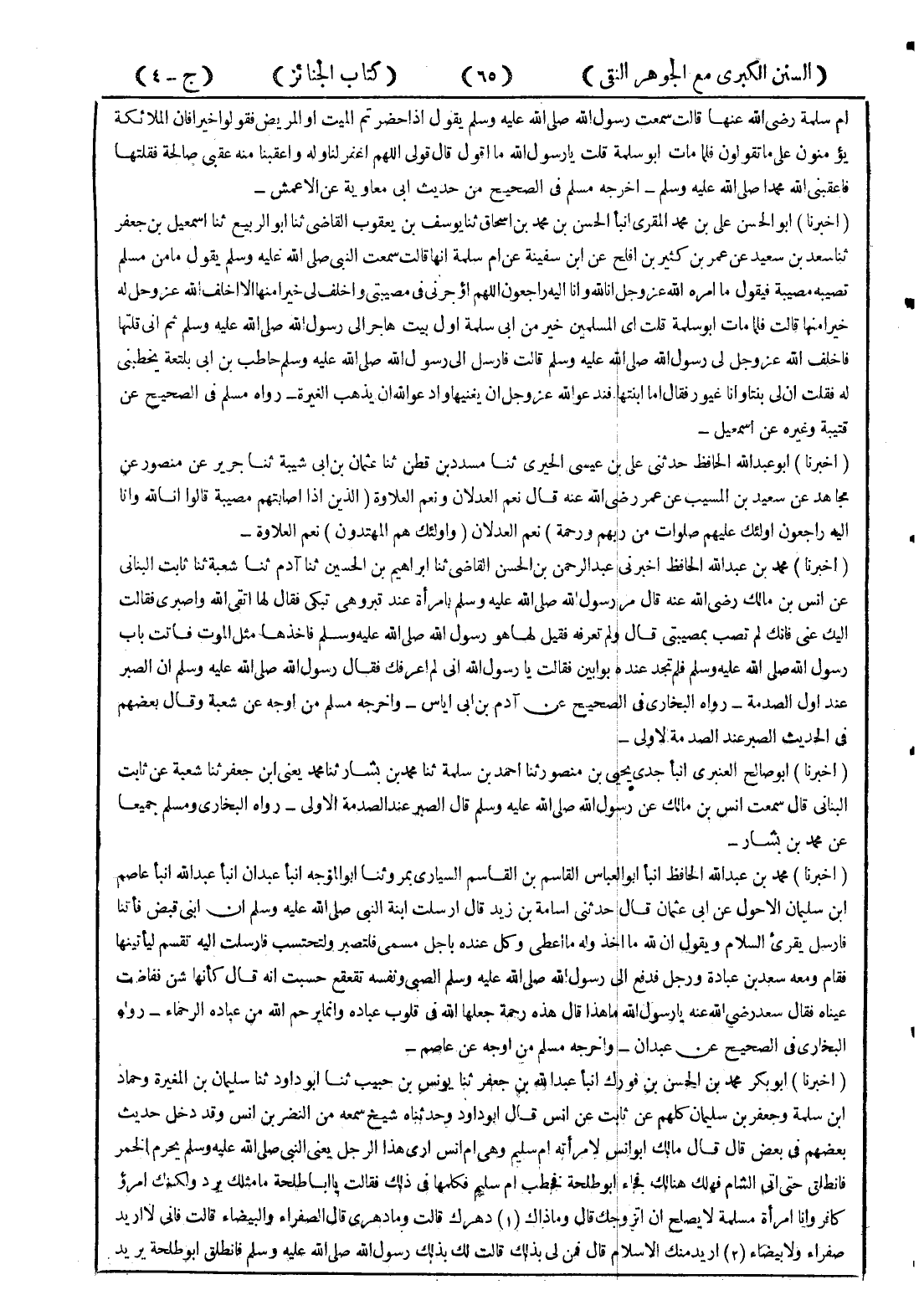 - (أخبرنا) محمد بن عبد الله الحافظ انبأ أبو العباس القاسم بن القاسم السياري بمرو ثنا أبو الموجه انبأ عبدان انبأ عبد الله انبأ عاصم ابن سليمان الاحول عن ابي عثمان قال حدثني اسامة بن زيد قال ارسلت ابنة النبي صلى الله عليه وسلم ان ابني قبض فأتنا فارسل يقرئ السلام ويقول ان لله ما اخذ وله ما اعطى وكل عنده باجل مسمى فلتصبرو لتحتسب فارسلت إليه تقسم ليأتينها فقام ومعه سعد بن عبادة ورجل فدفع إلى رسول الله صلى الله عليه وسلم الصبي ونفسه تقعقع حسبت انه قال كأنها شن ففاضت عيناه فقال سعد رضي الله عنه يا رسول الله ما هذا قال هذه رحمة جعلها الله في قلوب عباده وانما يرحم الله من عباده الرحماء - رواه البخاري في الصحيح عن عبدان - واخرجه مسلم من اوجه عن عاصم