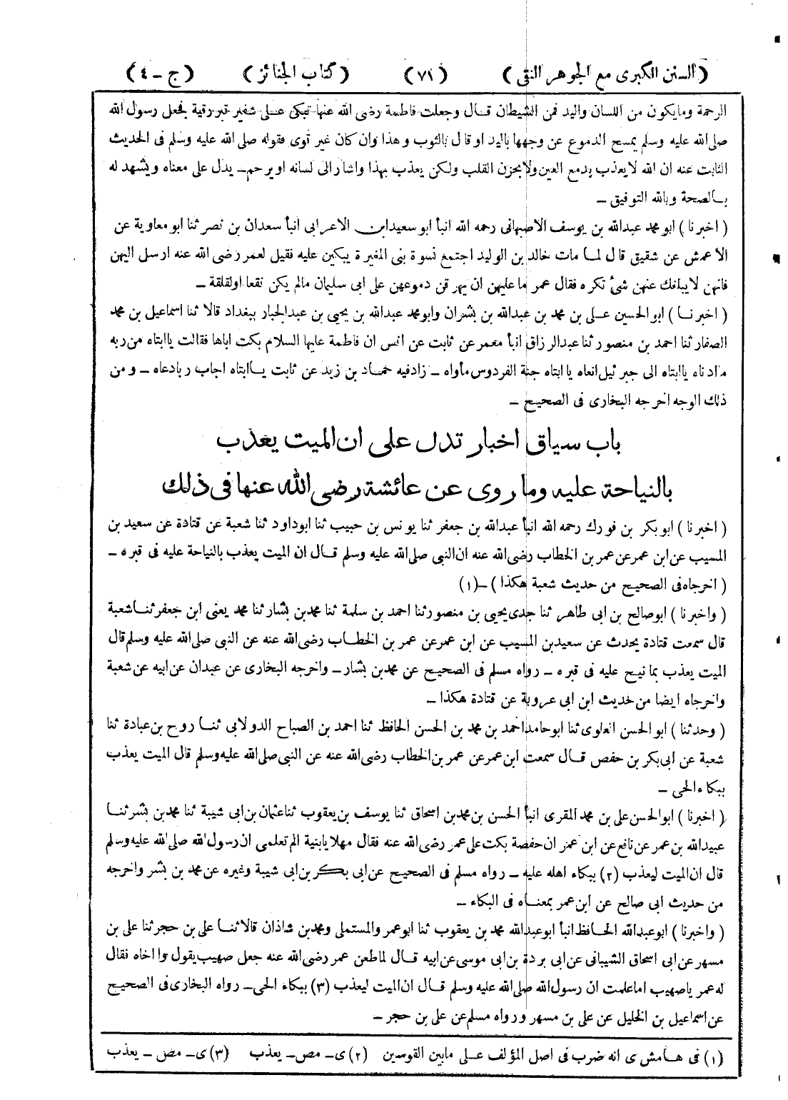 (وأخبرنا) أبو عبد الله الحافظ ابنأ أبو عبد الله محمد بن يعقوب ثنا أبو عمرو المستملي ومحمد بن شاذان قالا ثنا علي بن حجر ثنا علي بن مسهر عن ابي اسحاق الشيباني عن ابي بردة بن ابي موسى عن ابيه قال لما طعن عمر رضي الله عنه جعل صهيب يقول وا اخاه فقال له عمر يا صهيب اما علمت ان رسول الله صلى الله عليه وسلم قال ان الميت ليعذب (3) ببكاء الحي - رواه البخاري في الصحيح عن اسماعيل بن الخليل عن علي بن مسهر ورواه مسلم عن علي بن حجر -
