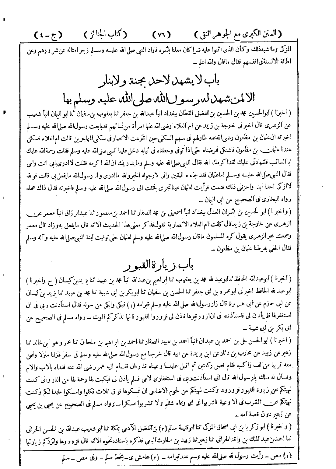 - (أخبرنا) أبو الحسن علي بن احمد بن عبدان انبأ احمد بن عبيد الصفار ثنا احمد بن ابراهيم بن ملحان ثنا عمر وهو ابن خالد ثنا زهير عن زبيد عن محارب بن دثار عن ابن بريدة عن ابيه قال خرجنا مع رسول الله صلى الله عليه وسلم في سفر فنزلنا منزلا ونحن معه قريبا من الف راكب فقام فصلى ركعتين ثم اقبل علينا وعيناه تذرفان فقام إليه عمر رضي الله عنه ففداه بالاب والام وقال له مالك يا رسول الله قال اني استأذنت ربي في استغفاري لامي فلم يأذن لي فبكيت لها رحمة لها من النار واني كنت نهيتكم عن زيارة القبور فزوروها وكنت نهيتكم عن لحوم الاضاحي ان تمسكوها فوق ثلاث فكلوا وامسكوا ما بدا لكم وكنت نهيتكم عن الشرب في الاوعية فاشربوا في اي وعاء شئتم ولا تشربوا مسكرا - رواه مسلم في الصحيح عن يحيى بن يحيى عن زهير دون قصة امه -