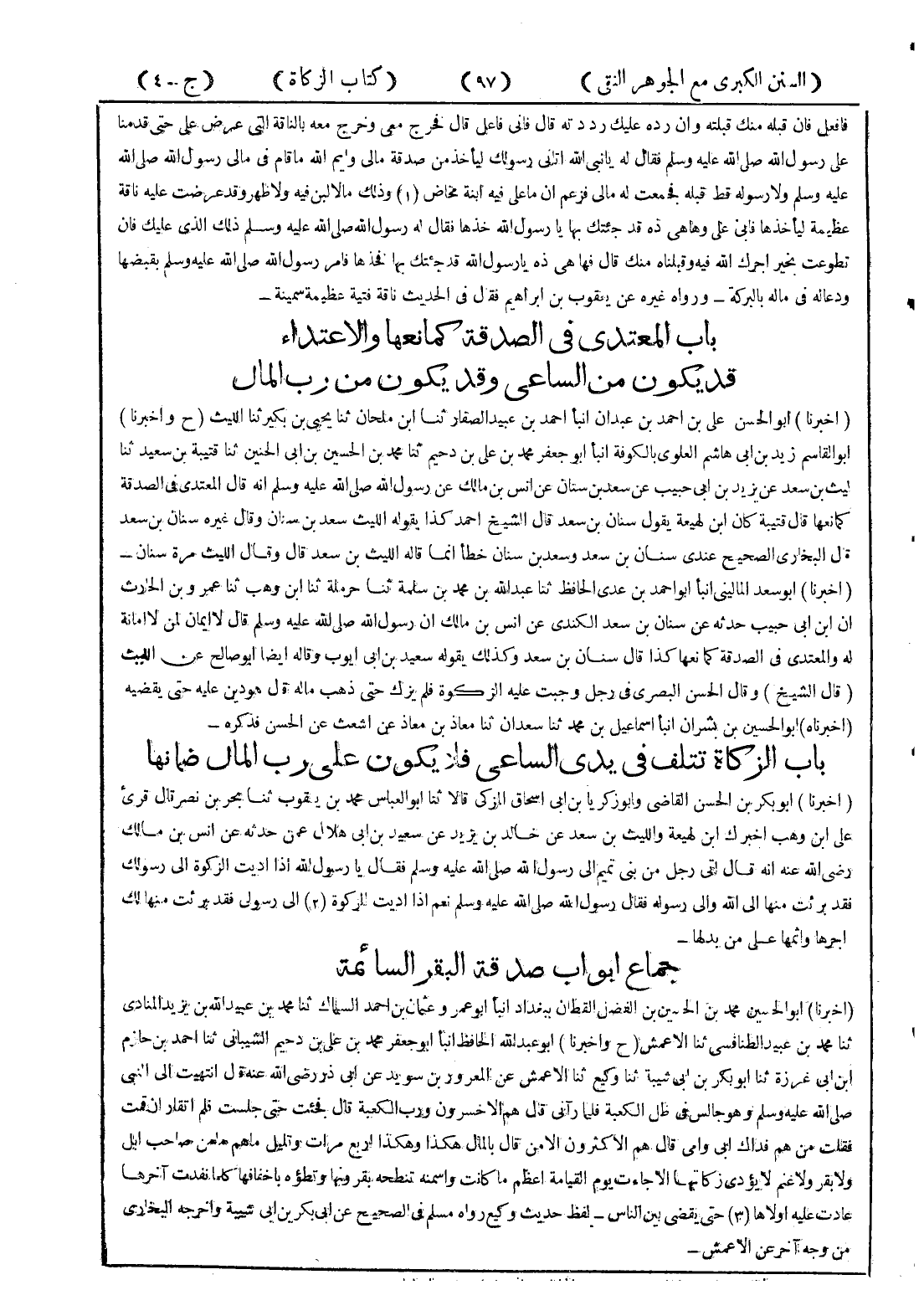 (أخبرنا) أبو الحسين محمد بن الحسين بن الفضل القطان ببغداد انبأ أبو عمرو عثمان بن احمد السماك ثنا محمد بن عبيد الله بن يزيد المنادي ثنا محمد بن عبيد الطنافسي ثنا الاعمش (ح واخبرنا) أبو عبد الله الحافظ انبأ أبو جعفر محمد بن علي بن دحيم الشيباني ثنا احمد بن حازم ابن ابي غرزة ثنا أبو بكر بن ابي شيبة ثنا وكيع ثنا الاعمش عن المعرور بن سويد عن ابي ذر رضي الله عنه قال انتهيت إلى النبي صلى الله عليه وسلم وهو جالس في ظل الكعبة فلما رآني قال هم الاخسرون ورب الكعبة قال فجئت حتى جلست فلم اتقار ان قمت فقلت من هم فداك ابي وامي قال هم الاكثرون الا من قال بالمال هكذا وهكذا اربع مرات وقليل ما هم ما من صاحب ابل ولابقر ولاغنم لايؤدي زكاتها الا جاءت يوم القيامة اعظم ما كانت واسمنه تنطحه بقرونها وتطؤء باخفافها كلما نفدت آخرها عادت عليه اولاها (3) حتى يقضي بين الناس - لفظ حديث وكيع رواه مسلم في الصحيح عن ابي بكر بن ابي شيبة واخرجه البخاري من وجه آخر عن الاعمش -