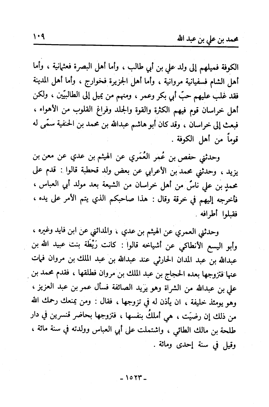 قتلت أَهْل الشام فأسرفت ثُمَّ قتلت أَهْل خراسان وكانوا أنصاركم وأولياء دعوتكم ثُمَّ انتحلْتَ الخلافة وقاتلت ابْن أخيك وَهُوَ الخليفة فلم تبقِ غاية وَلَمْ تدع جُهْدًا ثُمَّ هربت إِلَى غَيْر ملجأ ولا حرز فهلا متّ كريما، اما والله لنُقاسين ذلًا طويلًا، فغضب فطلقها، وَكَانَ لَهُ منها مُحَمَّد وعيسى وأم مُحَمَّد وأم عبد الله، بنو عبد الله ابن عَلِي. ولما هرب ابْن عَلِي بلغ الْمَنْصُور أَن عَبْد الحميد بْن ربعي أبا غانم بالرها، وَكَانَ صديقًا لأبي الأزهر المهلب بْن العبيثر [3] المهري فوجهه لطلب الشراة وأهل الفساد من الأعراب ويُسكن النَّاس فجعل يقتل الأعراب من أَهْل الدعارة حَتَّى أتى الرُّها فبعث إِلَى أَبِي غانم: إني مشتاق إليك وَقَدْ وَجِّهتُ فِي أمر فتركتُه وملتُ إليك لأحدث بك عهْدًا. فخرج إِلَيْهِ وجعلا يتنادمان ثُمَّ ذاكره الخروج