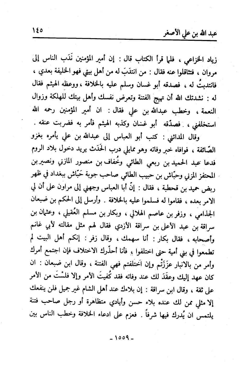 وكتب أَبُو الْعَبَّاس إِلَى الْحَسَن: إِنَّمَا وجهتُ أَخِي إِلَى مَا قبلك ليسكن النَّاس إِلَيْهِ (598) ويثق ابْن هبيرة بأمانه إِن طلب الأمان وأنتَ عَلَى أمرك وجيشك والتدبير لَك. ثُمَّ التقوا وأهل الشام فانهزم أَهْل الشام، وثبت معن بْن زائدة الشيباني وَكَانَ مَعَ ابْن هبيرة فقاتل، وترجل أَبُو نصر مَالِك بْن الهيثم ثُمَّ افترقوا. ومكثوا أياما، فخرج معن بْن زائدة ومحمد بْن نباتة بْن حنظلة فقاتلوا أَهْل خراسان فهزموهم إِلَى دجلة، فَقَالَ لَهُمْ أَبُو نصر: يَا أَهْل خراسان، ويلكم إِلَى أَيْنَ تفرون، إِن الْمَوْت بالسَيْف خيرٌ منه غرقًا، فثابوا وحملوا فهزموا [5] أَهْل الشام، فكانوا عَلَى ذَلِكَ أحد عشر شهرًا.