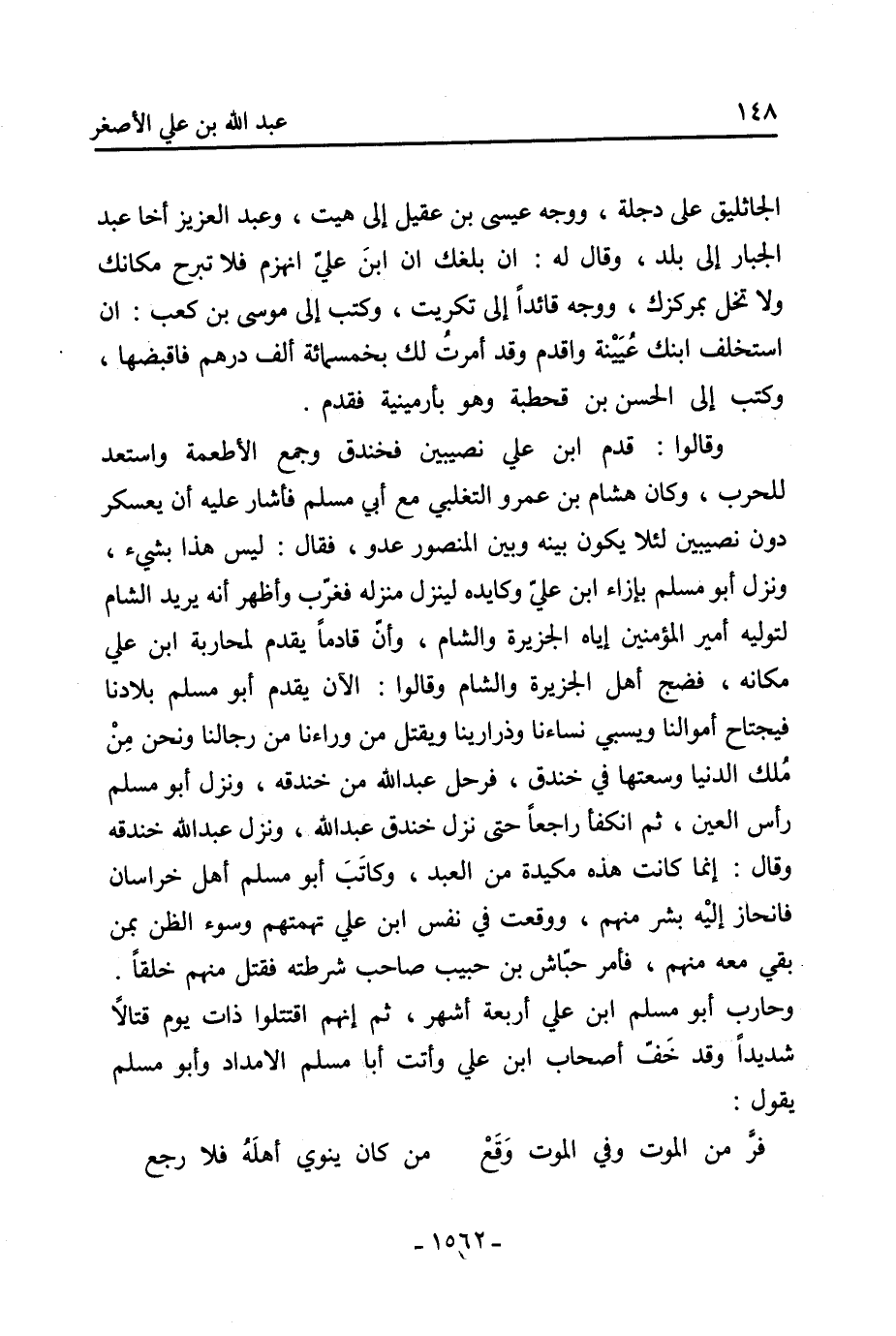 (599) أَبُو الْحَسَن الْمَدَائِنِيُّ عَنْ مُسْلِم بْن المغيرة قَالَ: كنت مَعَ أَبِي أيوب الخوزي فِي عسكر أَبِي جَعْفَر، وَكَانَ لأبي جَعْفَر بَيْت قَدْ بَنِي لَهُ ومضربُه [3] يحيط بِهِ وَكَانَ فِي ستارة المضرب [4] خلل، فكنت أنظر منه فرأيت الْحَسَن بْن قحطبة إِلَى جانب الْمَنْصُور يحدثه، ثُمَّ دعا بحوثرة [5] بْن سهيل فجاء عُثْمَان فأخذ سَيْفه فأراد أَن يتكلم ثُمَّ سكت فأدخل الْبَيْت وأغلق عَلَيْهِ. ثُمَّ خرج سلام صاحب أَبِي جَعْفَر فدعا بمحمد بْن نباتة فصنع به مثل ذلك، ثُمَّ خرج فَقَالَ: أَيْنَ يَحْيَى بْن الحضين [6] ؟ ثُمَّ دُعي ببشر بْن عَبْدِ الْمَلِك بْن بشر، أَوْ قَالَ بالحكم بْن عَبْدِ الْمَلِك، فقام ومعه أخوه أبان فَقَالَ: مَا فرق بيني وبينه شَيْء قط، فَقَالَ لَهُ سلام: اجلس فإنما نفعل مَا نؤمر بِهِ فجلس. ثُمَّ دعا بخالد بْن سنان المري وَكَانَ عَلَى شرطة ابْن هبيرة، ثُمَّ قتل خَالِد بْن سلمة المخزومي وابنه، ثُمَّ قتل حرب بْن قطن الهلالي، ثُمَّ خرج سلام فَقَالَ للناس: انصرفوا. قال مسلم ابن المغيرة: فسألت عُثْمَان بْن نُهيك عَنِ السبعة النفر، فَقَالَ: أما حوثرة فَإِنِّي أدخلت [7] السَيْف بَيْنَ ضلعين من أضلاعه وقلتُ: يَا عدو اللَّه أَنْتَ الكاتب إِلَى مَرْوَان إِن اللَّه مخزيهم، ثُمَّ لَمْ يُرضك إلّا شتمنا! وَلَمْ يكن في القوم اجزع من ابْن نباتة كَانَ يصيح كَمَا يصيح الصبيان عَلَى شجاعته وبأسه. وَأَمَّا خَالِد بْن سنان فَقَالَ: يَا مجوس قتلتمونا غدرًا، والله لَقَدْ قتلنا سيدكم قحطبة. وقتل مَعَ ابْن هبيرة رباح بْن أَبِي عُمَارَةَ مَوْلَى هِشَام، وَكَانَ هِشَام اشتراه بعشرة آلاف فأعتقه، فَلَمَّا جرى الصلح بَيْنَ ابْن هبيرة وبين أَبِي جعفر قال له ابو جعفر: