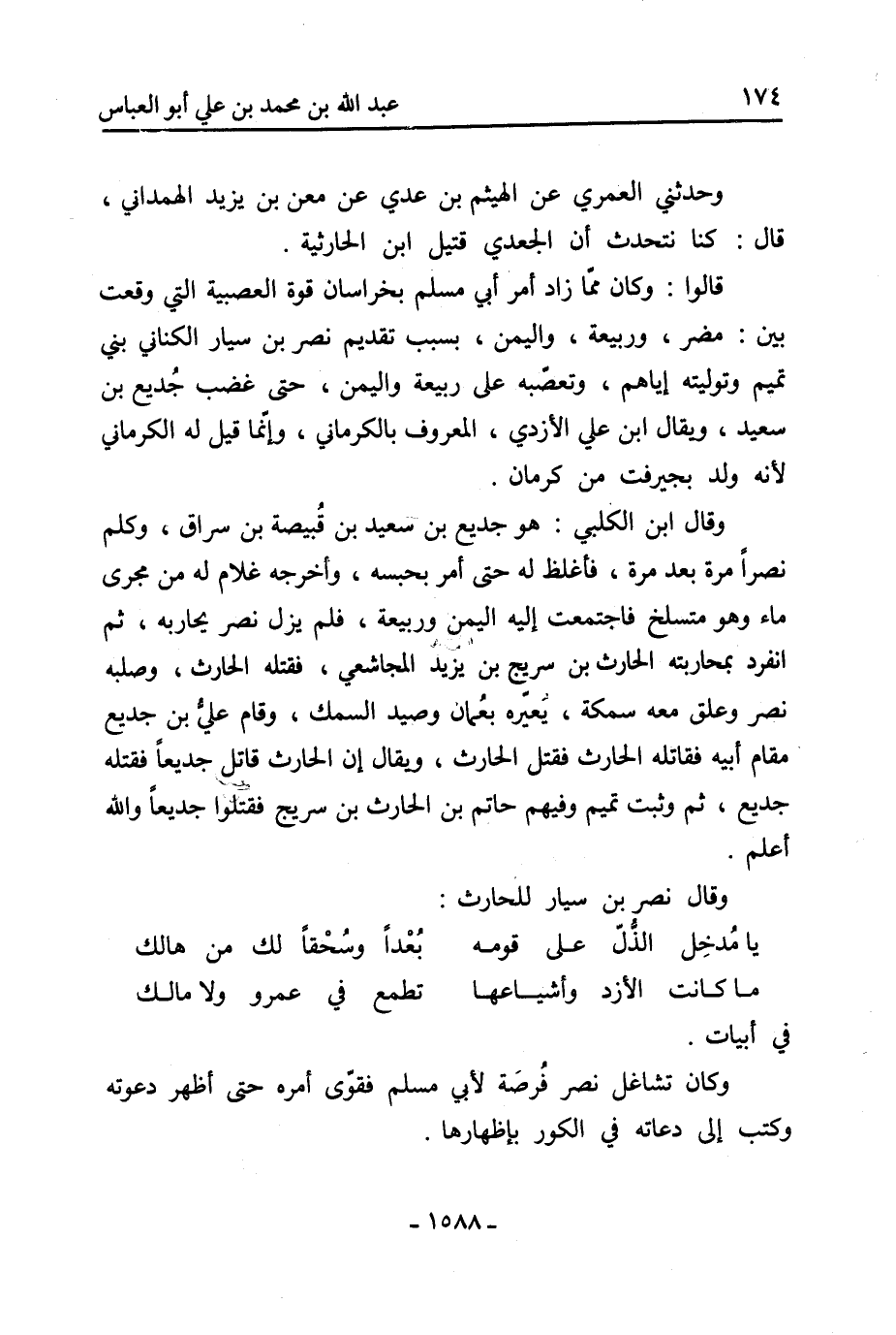 ونسي أَبُو عَمْرو مَا فِيهَا من هجاء قَيْس، فوقف، وعرف سلم مَا سبب وقوفه فَقَالَ: هات لِلَّهِ أبوك، فَقَالَ: اعفني أصلح اللَّه الأمير، قَالَ: والله لتسلسلنها فِي آذانهم فِي سواد هَذَا الليل. الْمَدَائِنِي قَالَ: قيل لسلم بْن قُتَيْبَة: