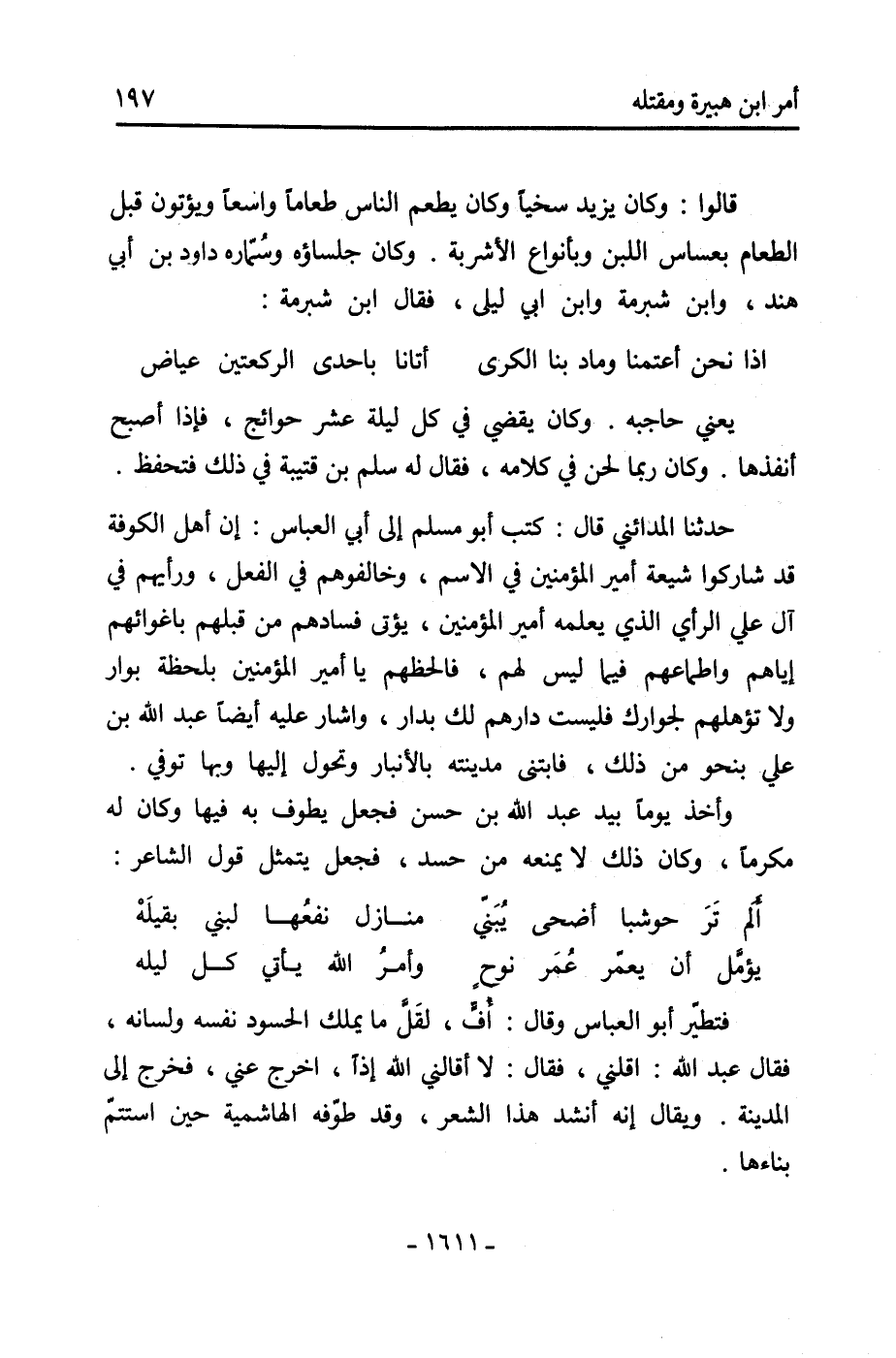 وحدثني الرَّبِيع بْن عُبَيْد اللَّه بْن عَبْدِ اللَّهِ بْن عَبْدِ المدان وأخوه زِيَاد، وَحَدَّثَنِي بَعْض ولد الْمَنْصُور، أَنَّهُ كَانَ إِذَا ولد لرجل [1] من أَهْل بيته مولود ذكر أمر لَهُ من دار الرقيق بظئر وجارية تخدمه ووصيف، وأمر لأمه بجاريتين ومائتي دِينَار وطيب، وَإِذَا كَانَ المولود أنثى بعث نصف ذَلِكَ. وَحَدَّثَنِي أَبُو مَسْعُود وغيره قَالُوا: قدم إِسْحَاق الأزرق، صاحب الدار ببغداد عِنْدَ القنطرة العتيقة وَهُوَ مَوْلَى الْمَنْصُور، عَلَيْهِ بامرأتين كَانَ أشخصه لحملهما، (625) إحداهما فاطمة بِنْت مُحَمَّد الطلحية والأخرى أمةُ الكريم بِنْت عَبْد الرَّحْمَن بْن عَبْد اللَّهِ من ولد خَالِد بْن أسيد بْن أَبِي العاص، ويقال العالية بِنْت عَبْد الرَّحْمَن بْن عَبْدِ اللَّهِ [2] بْن خَالِد بْن أسيد، فَقَالَتْ لَهُ ريسانة قيّمة نسائه: يَا أمِير الْمُؤْمِنيِنَ ان الطليحة قد استحفتك [3] واستبطأت برك وأنكرت وصاحبتها تركك الدعاء لهما، فقال: أما ترين مَا نَحْنُ فِيهِ، وَكَانَ إِبْرَاهِيم بْن عَبْدِ اللَّهِ قَدْ خرج بالبصرة، ثُمَّ أنشد: