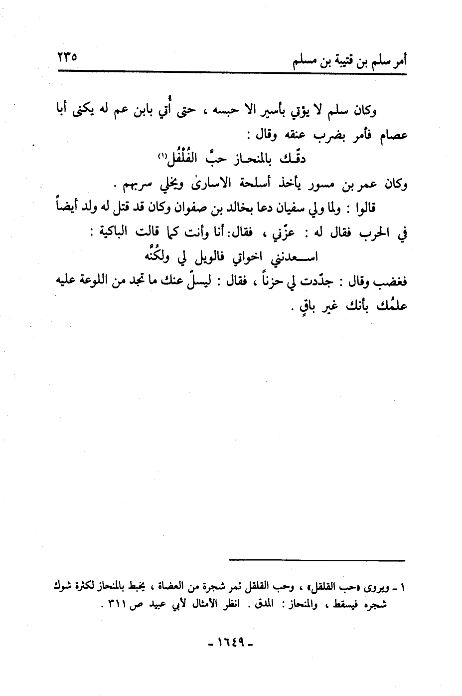 حَدَّثَنِي أَبُو مَسْعُود والعمري عَنِ الهيثم وغيره، أَن قومًا من أَصْحَاب أَبِي مُسْلِم من أَهْل خراسان كَانُوا يقولون بتناسخ الأرواح، فيزعمون أَن روح آدم عَلَيْهِ السَّلام فِي عُثْمَان بْن نهيك، ويقولون إِن أمِير الْمُؤْمِنيِنَ يرزقنا ويطعمنا ويسقينا فَهُوَ ربنا، وأنه لو شاء أَن يسير الجبال لسارت ولو أمرنا أَن نستدبر القبلة لاستدبرناها، وكانوا يطوفون حول قصر الْمَنْصُور فيقولون قولًا عظيمًا، فحبس الْمَنْصُور مِنْهُم نحوًا من مائتين من رؤسائهم فغضب أَصْحَابهم. وَكَانَ الْمَنْصُور أمر أَن لا يجتمعوا، فاتخذوا نعشًا وأظهروا أَن فِيهِ امْرَأَة ميتة وملأوه سلاحًا ثُمَّ حملوه ومروا إِلَى بَاب السجن فأخرجوا أَصْحَابهم وَهُمْ مائتان وكانوا أربع مائة فتتاموا ست مائة، وقصدوا القصر فتنادى الناس وأغلقت أَبُواب الْمَدِينَةِ. وخرج الْمَنْصُور يمشي من القصر وَلَمْ يكن عنده دابة، فَمَنْ ذَلِكَ اليوم ارتبط فرسًا فِي القصر يَكُون مَعَهُ، فلما برز أمِير الْمُؤْمِنيِنَ أُتي بدابة فركبها وقصد قصدهم، فجاء معن بْن زائدة الشيباني حَتَّى دنا منه ثُمَّ ترجل وأخذ أسافل ثيابه فجعلها فِي منطقته وأخذ بلجام دابة أمِير الْمُؤْمِنيِنَ وَقَالَ: أنشدك اللَّه إلّا رجعت فإنك تُكفى إِن شاء اللَّه. ونودي فِي أَهْل السوق والعامة فرموهم بالحجارة وقاتلوهم وفتح بَاب الْمَدِينَةِ (646) فدخل النَّاس، وجاء خازم عَلَى فرس محذوف فحمل عَلَيْهِم فكشفهم، وقاتل معن يَوْمَئِذٍ قتالا [1] لم ير مثله فكان المنصور