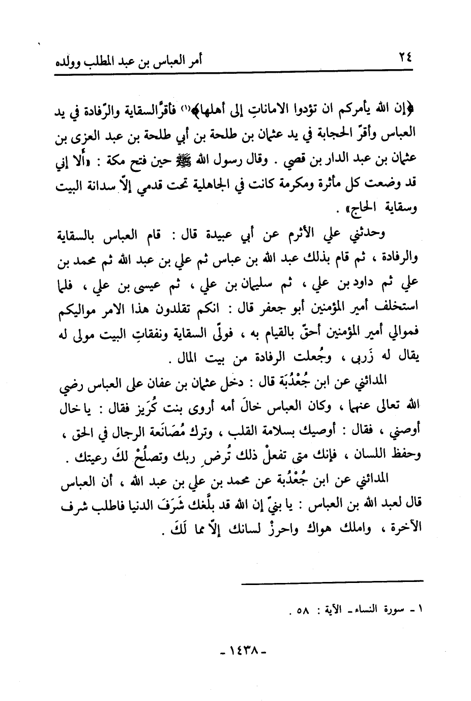 حَدَّثَنِي عَلِي بْن مُحَمَّد النوفلي عَنْ أَبِيهِ قَالَ: كَانَ يُقَالُ من أراد الجمال والفقه والسخاء فليأت دار الْعَبَّاس بْن عَبْدِ الْمُطَّلِبِ: الجمالُ للفضلِ، والفقه لعبد اللَّه، والسخاء لعبيد اللَّه [3] .