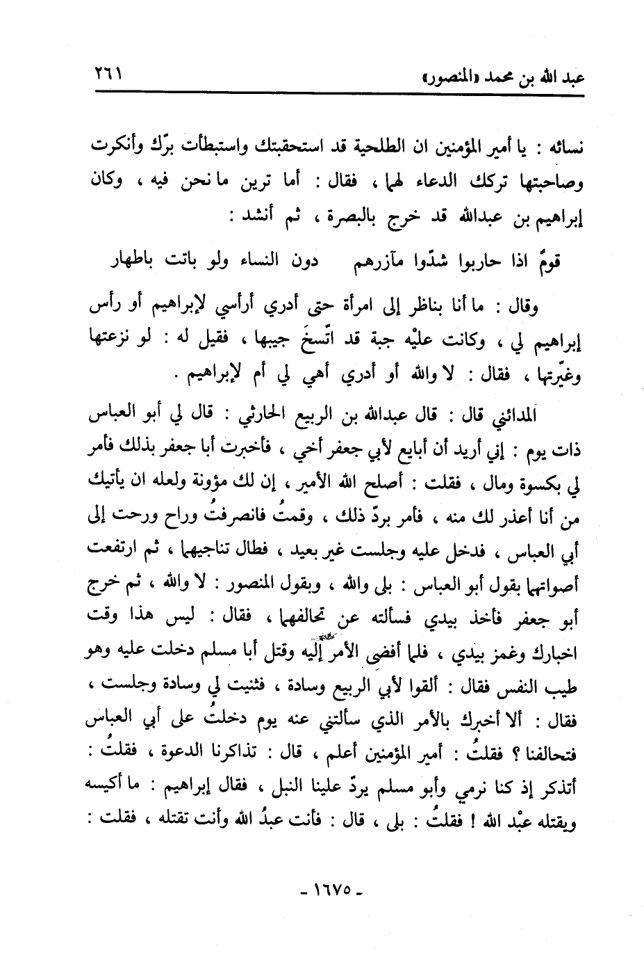 وَحَدَّثَنِي أَبُو الْحَسَن الْمَدَائِنِي قَالَ: كاتب [2] العبسيون من أَهْل حيار بَنِي القعقاع ومن معهم مُحَمَّد بْن عَبْدِ اللَّهِ بْن حُسن. وكاتبهم مُحَمَّد، وَكَانَ مِمَّنْ كاتبه أَبُو ذفافة. فَلَمَّا شخص الْمَنْصُور إِلَى بَيْت المقدس فِي سنة أربع وخمسين ومائة وغزا الصائفة وتتبع الأجناد [3] والكور أقدم أَبَا ذفافة مَعَهُ فأصحبه الْمَهْدِي فخص بِهِ وَكَانَ يطلعه عَلَى أسراره وأموره، فَقَالَ لَهُ الرَّبِيع: يَا أمِير الْمُؤْمِنيِنَ قَدْ غلب ابو ذفاقة عَلَى الْمَهْدِي ورأيُه مَا تعلم، فَقَالَ: يَا بَنِي إِن الْمَهْدِي [4] قدم من الري فِي زي أَهْل خراسان فجهدتُ أَن أنقله عَنْ ذَلِكَ بكل حيلة يُحتال بِهَا فِي مواجهة وتعريض فلم ينتقل عَنْهُ، فَلَمَّا صحبه أَبُو ذفاقة لَمْ أشعر بِهِ ذَات يَوْم إلا وَقَدْ طلع عليّ معتمًا عَلَى قلنسوته وَفِي رجليه خفّان اسودان، فو الله لو ضُمّ إِلَى ملكي مثلّه مَا كَانَ ذَلِكَ بأسر [5] إليّ من هيئته، وإنما أَبُو ذفافة رَجُل أراد أَن ينال شَيْئًا من الدنيا فَقَدْ ناله وأكثر منه وَهُوَ رَجُل شريف وللشريف شكر فلا يسوْءنكم مكانه. حَدَّثَنِي الحرمازي قَالَ: قَالَ الرَّبِيع الحاجب: