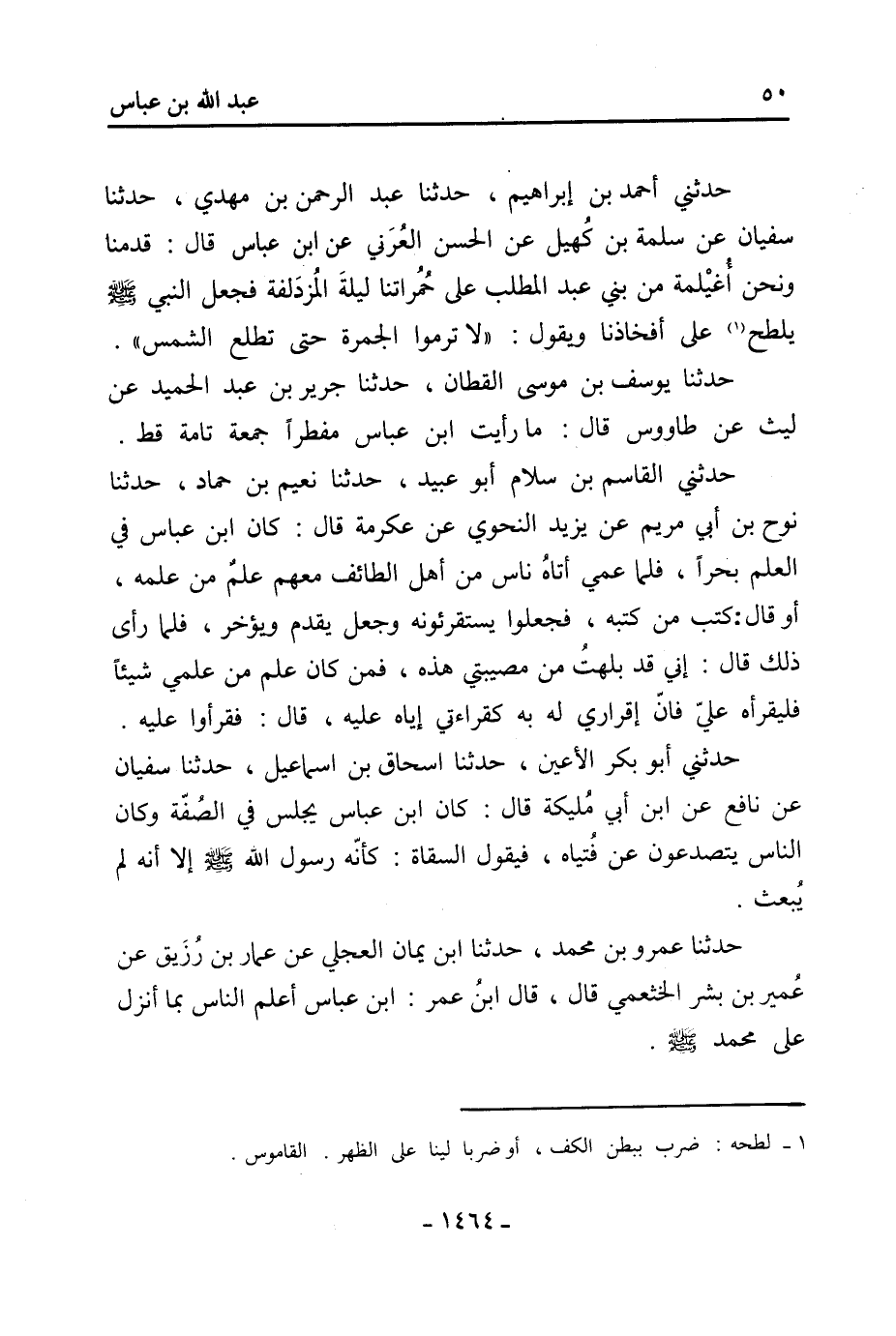حَدَّثَنِي مُصْعَب بْن عَبْدِ اللَّهِ عَن الْوَاقِدِيِّ عَن ابْنِ أَبِي الزِّنَادِ عَن مُوسَى بْن عقبة عَنِ القاسم بْن مُحَمَّد قَالَ: مَا رَأَيْتُ فِي مجلس ابْن عَبَّاس باطلًا قط.