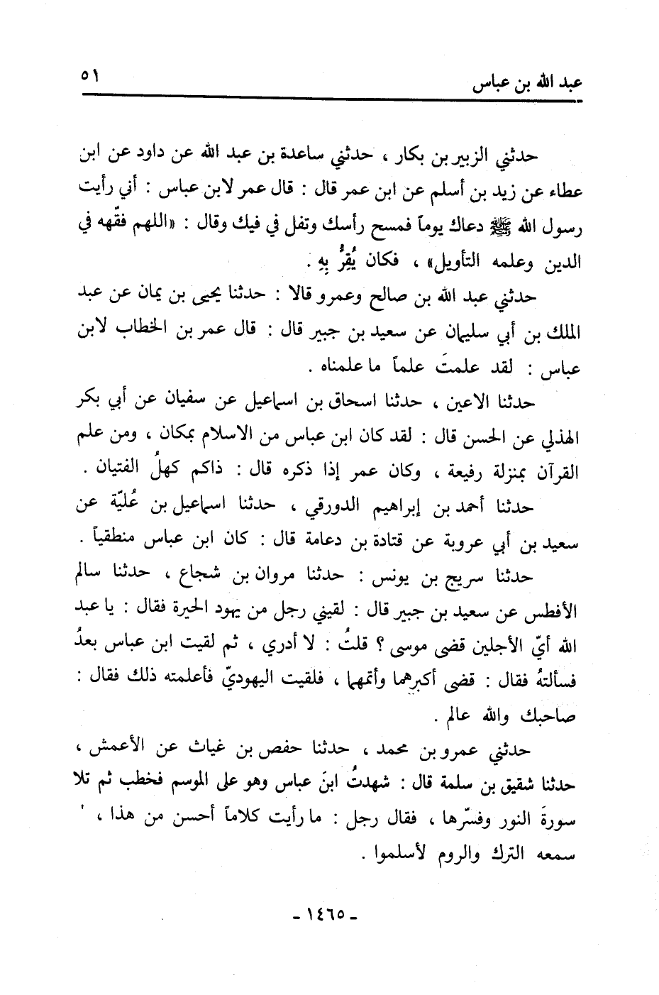 حَدَّثَنِي عَبَّاسٌ عَنْ أَبِيهِ عَنْ جَدِّهِ عَنْ أَبِي صَالِحٍ قَالَ: قَالَ ابْنُ عَبَّاسٍ: مَنِ الْتَمَسَ الدِّينَ بِالْمُخَاصَمَةِ حَيَّرَتْهُ الْمُنَازَعَةُ، وَلَنْ يَمِيلَ إِلَى الْمُغَالَبَةِ إِلا مَنْ أَعْيَاهُ سُلْطَانُ الْحُجَّةِ.