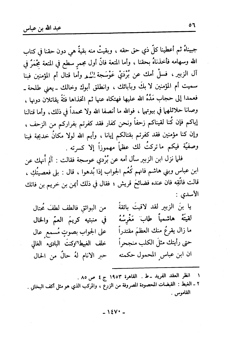 وَحَدَّثَنِي عَلِيُّ بْنُ مُحَمَّدٍ النَّوْفَلِيُّ عَنْ أَبِيهِ عن مشايخه قال: كانت بين الزبير ابن الْعَوَّامِ وَبَيْنَ عَبْدِ اللَّهِ بْنِ جَعْفَرٍ ضَيْعَةٌ بِالْقُرْبِ مِنَ الْمَدِينَةِ، فَلَمَّا قُتِلَ الزُّبَيْرُ سَأَلَ عَبْدُ اللَّهِ بْنُ الزُّبَيْرِ ابْنَ جَعْفَرٍ أَنْ يُقَاسِمَهُ فَأَجَابَهُ إِلَى ذَلِكَ، وَوَعَدَهُ الْبُكُورَ مَعَهُ إِلَيْهَا. وَمَضَى ابْنُ الزُّبَيْر إِلَى الْحَسَنِ وَالْحُسَيْنِ وَعُبَيْدِ اللَّهِ بْنِ الْعَبَّاسِ وَإِلَى جَمَاعَةٍ مِنْ أَبْنَاءِ الْمُهَاجِرِينَ وَالأَنْصَارِ فَسَأَلَهُمْ أَنْ يَحْضُرُوا مَا بَيْنَهُ وَبَيْنَ ابْنِ جَعْفَرٍ، فَأَجَابُوهُ وَغَدَوْا لِمِيعَادِهِ، وَوَافَاهُمُ ابْنُ جَعْفَرٍ، وَجَاءَ ابْنُ الزُّبَيْرِ مَعَهُ بِجَزُورٍ وَدَقِيقِهُ وَقَالَ لِوَكِيلِهِ: أَنِخِ الْجَزُورَ نَاحِيَةً وَاسْتُرْ [1] أَمْرَهَا وَلا تُحْدِثَنَّ فِيهَا حَدَثًا حَتَّى آمُرَكَ فَإِنِّي لا آمَنَ انْتِقَاضُ هَذَا الأمْرِ بَيْنِي وَبَيْنَ ابْنِ جَعْفَرٍ، ثُمَّ سَأَلَ الْقَوْمَ أَنْ يَسْأَلُوا عَبْدَ اللَّهِ بْنَ جَعْفَرٍ أَخَذَ الْغَامِرِ [2] مِنَ الضَّيْعَةِ وَتَسْلِيمَ الْعَامِرِ [3] لَهُ، فَكَلَّمُوهُ فَأَجَابَهُمْ إِلَى ذَلِكَ، وَجَاعَ [4] الْقَوْمُ حَتَّى تَشَاكُوا الْجُوعَ. فَقَالَ الْحَسَنُ بْنُ عَلِيٍّ: لَوْ كَانَتِ الْبَرَاذِينُ تُؤْكَلُ أَطْعَمْتُكُمْ بَرْذُونِي، وَقَالَ الْحُسَيْنُ: لَوْ كَانَتِ الْبِغَالُ تُؤْكَلُ أَطْعَمْتُكُمْ بَغْلِي، فَقَالَ عُبَيْدُ اللَّهِ بْنُ الْعَبَّاسِ: لَكِنَّ الْبَخَاتِيَّ تُؤْكَلُ، وَكَانَ تحته بختيّة قد ريضت فَأَنْجَبَتْ فَنَهَضَ إِلَيْهَا فَكَشَطَ عَنْهَا رَحْلَهَا، وَأَخَذَ [5] سَيْفَهُ فَوَجَأَ بِهِ لَبَّتَهَا، وَنَهَضَ النَّاسُ إِلَيْهَا بِكَسْرِ المَرْوِ وَالسَّكَاكِينَ وَغَيْرِ ذَلِكَ يَسْلُخُونَهَا، وَأَخَذُوا لَحْمَهَا وَأَوْقَدُوا سَعَفَ النَّخْلِ، وَبَعَثَ عُبَيْدُ اللَّهِ بْنُ الْعَبَّاسِ فَأَتَوُا بِقُدُورٍ وَخُبْزٍ كَثِيرٍ فَشَوَوْا وَطَبَخُوا، فَلَمْ يَشْعُرِ ابْنُ الزُّبَيْرِ إِلا بِرِيحِ القثاء وَبِالدُّخَانِ، فَظَنَّ أَنْ [6] وَكِيلَهُ نَحَرَ جَزُورَهُ، فَجَعَلَ يَشْتُمُهُ وَيَعْذِلُهُ، فَقَالَ لَهُ: يَرْحَمُكَ اللَّهُ، إِنَّ جزورك على