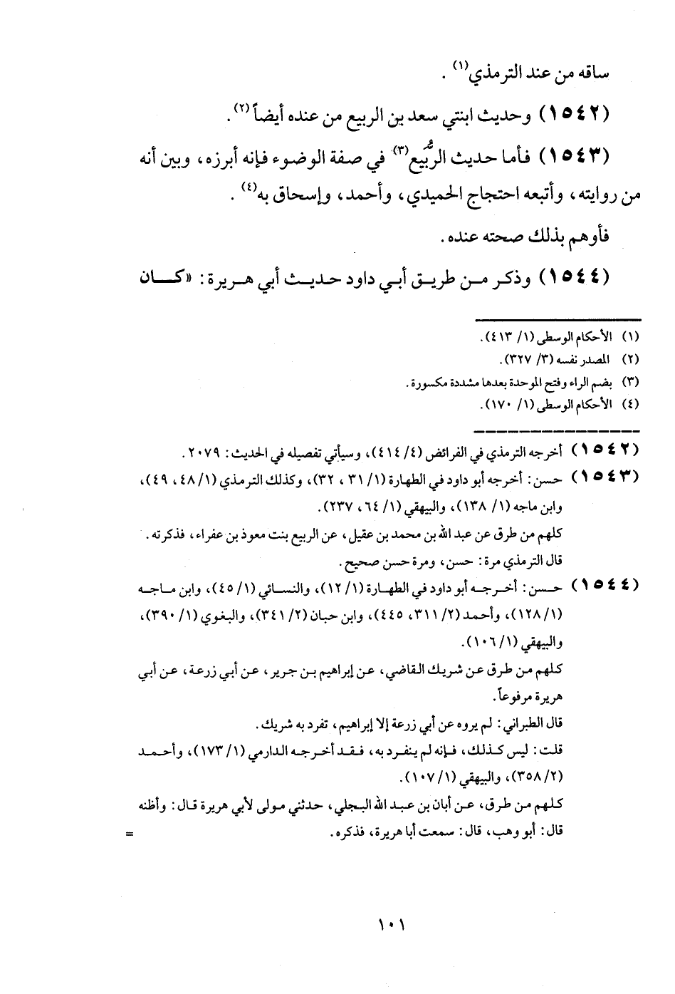 (1543) فَأَما حَدِيث الرّبيع فِي صفة الْوضُوء فَإِنَّهُ أبرزه، وَبَين أَنه من رِوَايَته، وَأتبعهُ احتجاج الْحميدِي، وَأحمد، وَإِسْحَاق بِهِ.