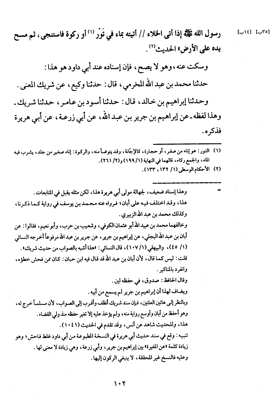 رَسُول الله - صَلَّى اللَّهُ عَلَيْهِ وَسَلَّم َ - إِذا أَتَى الْخَلَاء أَتَيْته بِمَاء فِي تور أَو ركوة فاستنجى، ثمَّ مسح يَده على الأَرْض " الحَدِيث.