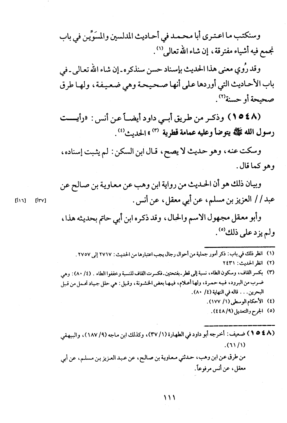 (1548) وَذكر من طَرِيق أبي دَاوُد أَيْضا عَن أنس: " رَأَيْت رَسُول الله - صَلَّى اللَّهُ عَلَيْهِ وَسَلَّم َ - يتَوَضَّأ وَعَلِيهِ عِمَامَة قطرية " الحَدِيث.