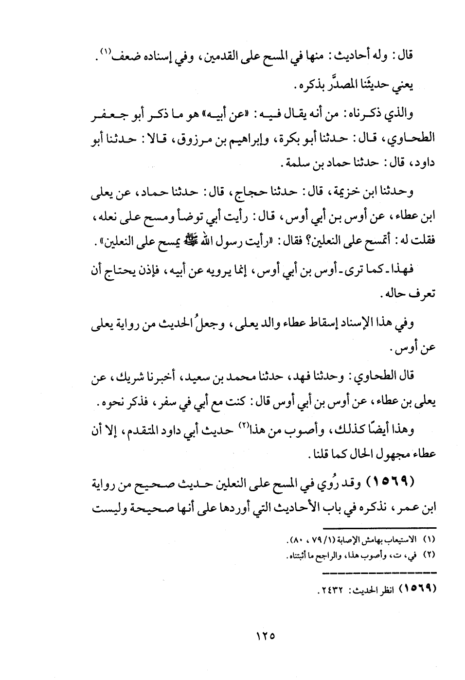 (1569) وَقد رُوِيَ فِي الْمسْح على النَّعْلَيْنِ حَدِيث صَحِيح من رِوَايَة ابْن عمر، نذكرهُ فِي بَاب الْأَحَادِيث الَّتِي أوردهَا على أَنَّهَا صَحِيحَة وَلَيْسَت