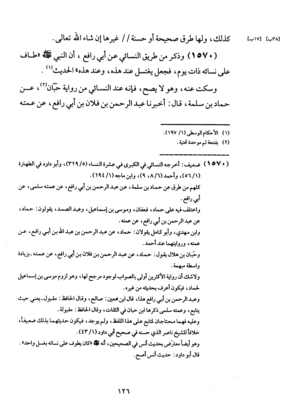(1570) وَذكر من طَرِيق النَّسَائِيّ عَن أبي رَافع، أَن النَّبِي - صَلَّى اللَّهُ عَلَيْهِ وَسَلَّم َ - " طَاف على نِسَائِهِ ذَات يَوْم، فَجعل يغْتَسل عِنْد هَذِه، وَعند هَذِه " الحَدِيث.