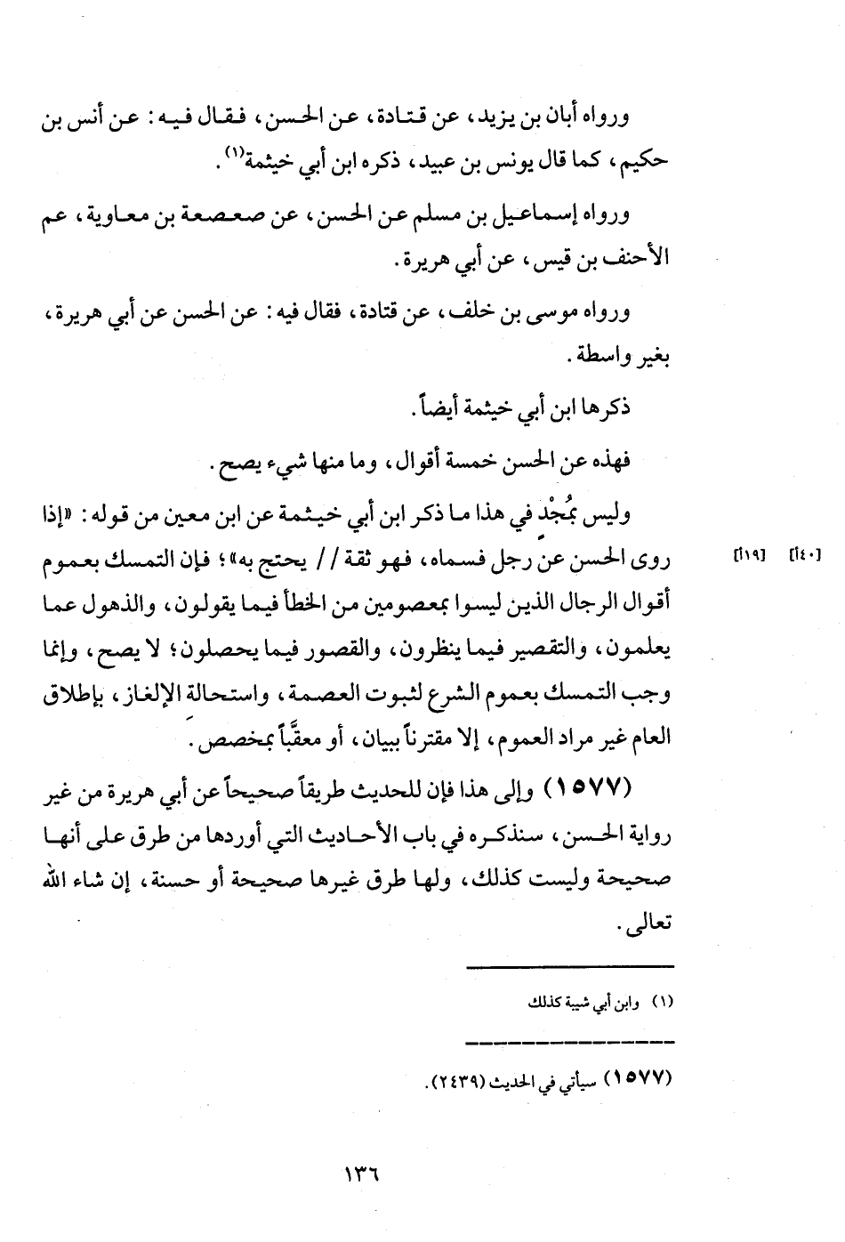 وَلَيْسَ بمجد فِي هَذَا مَا ذكر ابْن أبي خَيْثَمَة عَن ابْن معِين من قَوْله: " إِذا روى الْحسن عَن رجل فَسَماهُ، فَهُوَ ثِقَة يحْتَج بِهِ "؛ فَإِن التسمك بِعُمُوم أَقْوَال الرِّجَال الَّذين لَيْسُوا بمعصومين من الْخَطَأ فِيمَا يَقُولُونَ، والذهول عَمَّا يعلمُونَ، وَالتَّقْصِير فِيمَا ينظرُونَ، والقصور فِيمَا يحصلون؛ لَا يَصح، وَإِنَّمَا وَجب التَّمَسُّك بِعُمُوم الشَّرْع لثُبُوت الْعِصْمَة، واستحالة الإلغاز، بِإِطْلَاق الْعَام غير مُرَاد الْعُمُوم، إِلَّا مقترنا بِبَيَان، أَو معقبا بمخصص.