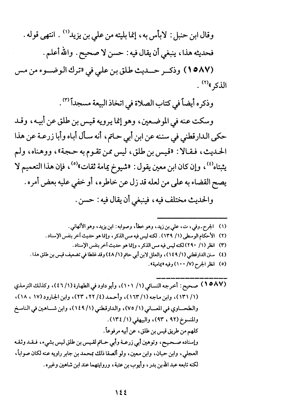 وَسكت عَنهُ فِي الْمَوْضِعَيْنِ، وَهُوَ إِنَّمَا يرويهِ قيس بن طلق عَن أَبِيه، وَقد حكى الدَّارَقُطْنِيّ فِي سنَنه عَن ابْن أبي حَاتِم، أَنه سَأَلَ أَبَاهُ وَأَبا زرْعَة عَن هَذَا الحَدِيث، فَقَالَا: " قيس بن طلق، لَيْسَ مِمَّن تقوم بِهِ حجَّة "، ووهناه، وَلم يثبتاه، وَإِن كَانَ ابْن معِين يَقُول: " شُيُوخ يمامة ثِقَات "، فَإِن هَذَا التَّعْمِيم لَا يَصح الْقَضَاء بِهِ على من لَعَلَّه قد زل عَن خاطره، أَو خَفِي عَلَيْهِ بعض أمره.