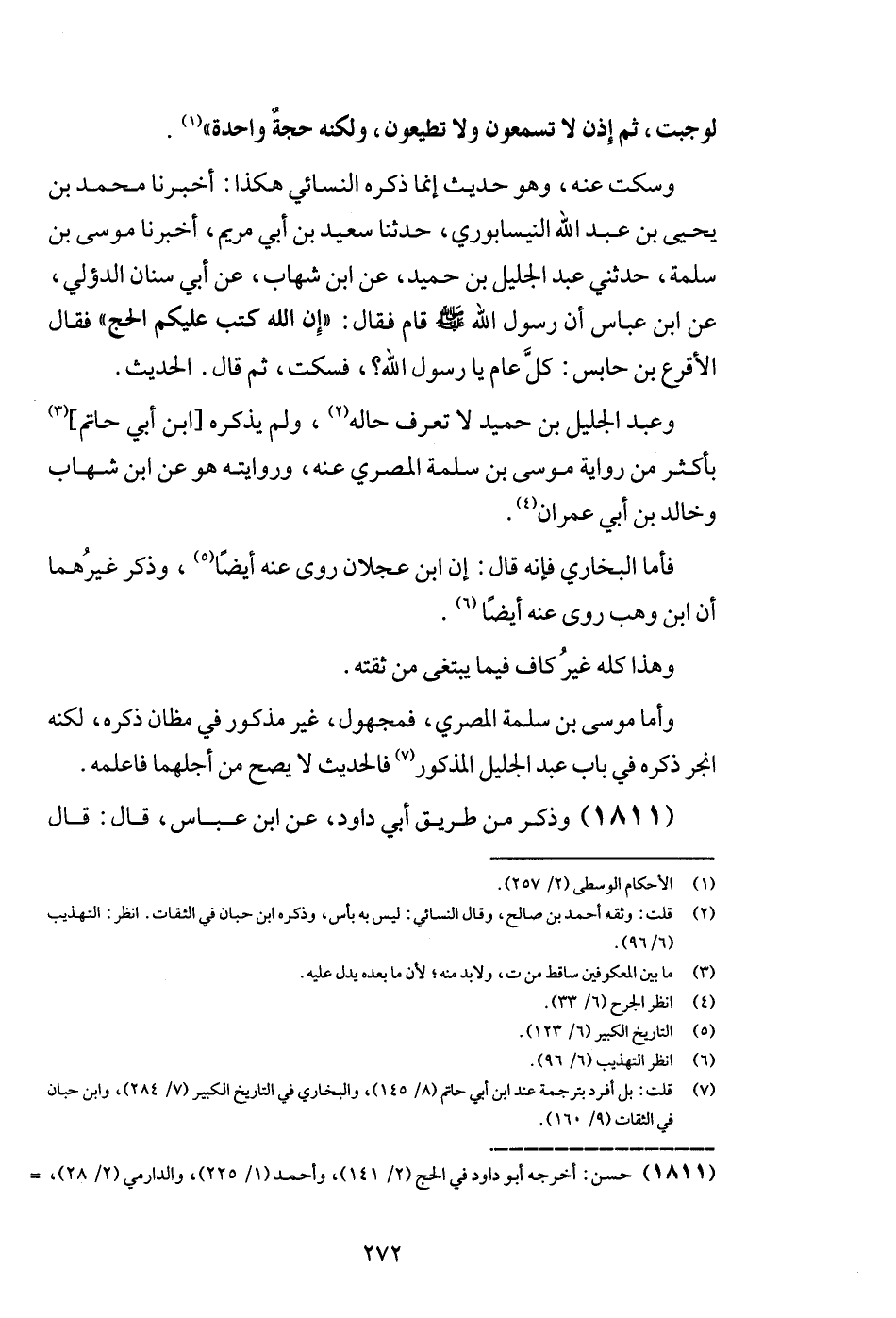وَسكت عَنهُ، وَهُوَ حَدِيث إِنَّمَا ذكره النَّسَائِيّ هَكَذَا: أخبرنَا مُحَمَّد بن يحيى بن عبد الله النَّيْسَابُورِي، حَدثنَا سعيد بن أبي مَرْيَم، أخبرنَا مُوسَى بن سَلمَة، حَدثنِي عبد الْجَلِيل بن حميد، عَن ابْن شهَاب، عَن أبي سِنَان الدؤَلِي، عَن ابْن عَبَّاس أَن رَسُول الله - صَلَّى اللَّهُ عَلَيْهِ وَسَلَّم َ - قَامَ فَقَالَ: " إِن الله كتب عَلَيْكُم الْحَج " فَقَالَ الْأَقْرَع بن حَابِس: كل عَام يَا رَسُول الله؟ ، فَسكت، ثمَّ قَالَ. الحَدِيث.
