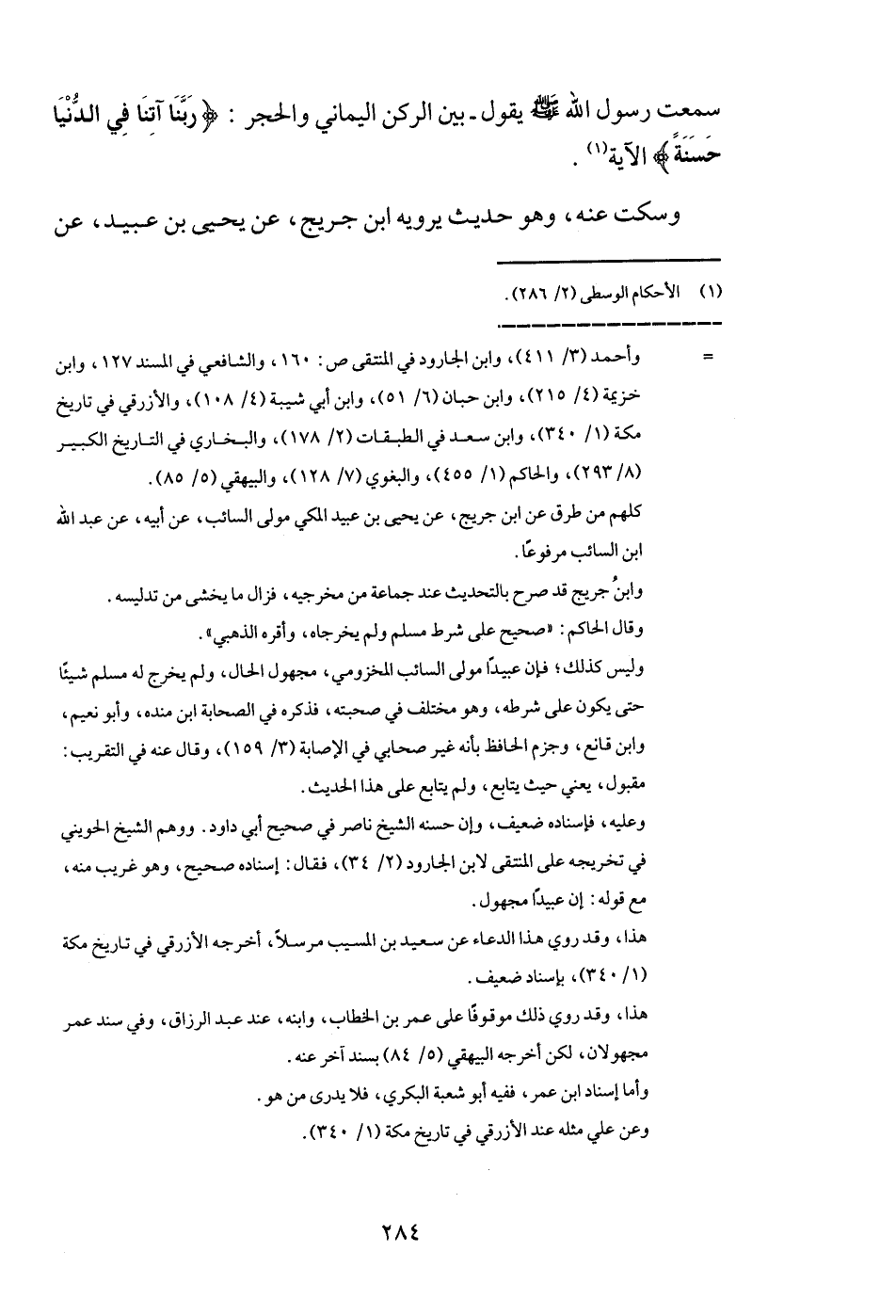 سَمِعت رَسُول الله - صَلَّى اللَّهُ عَلَيْهِ وَسَلَّم َ - يَقُول - بَين الرُّكْن الْيَمَانِيّ وَالْحجر: {رَبنَا آتنا فِي الدُّنْيَا حَسَنَة} الْآيَة.