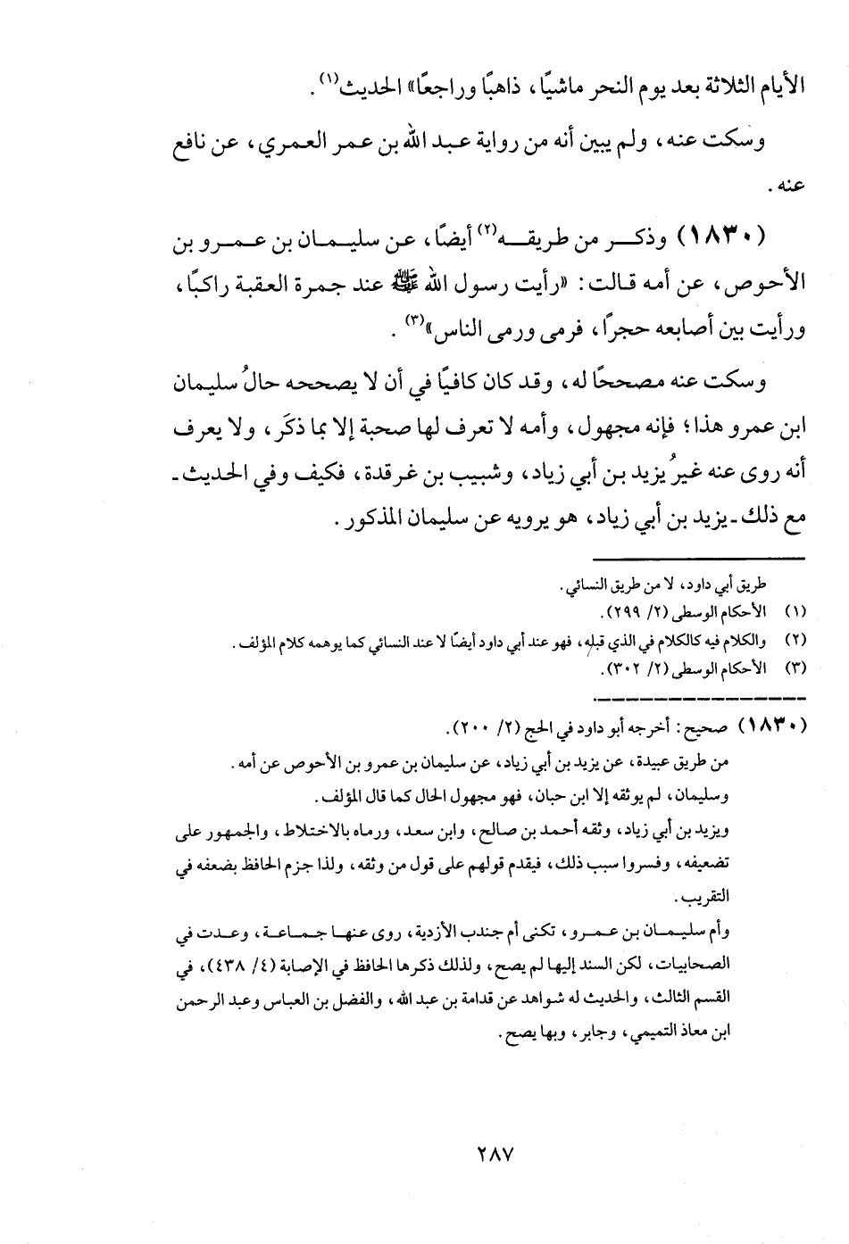 (1830) وَذكر من طَرِيقه أَيْضا، عَن سُلَيْمَان بن عَمْرو بن الْأَحْوَص، عَن أمه قَالَت: " رَأَيْت رَسُول الله - صَلَّى اللَّهُ عَلَيْهِ وَسَلَّم َ - عِنْد جَمْرَة الْعقبَة رَاكِبًا، وَرَأَيْت بَين أَصَابِعه حجرا، فَرمى وَرمى النَّاس ".