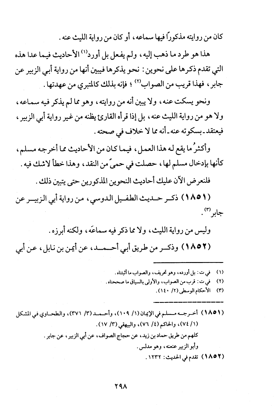 وَنَحْو يسكت عَنهُ، وَلَا يبين أَنه من رِوَايَته، وَهُوَ مِمَّا لم يذكر فِيهِ سَمَاعه، وَلَا هُوَ من رِوَايَة اللَّيْث عَنهُ، بل إِذا قَرَأَهُ الْقَارئ يَظُنّهُ من غير رِوَايَة أبي الزبير، فيعتقد - بسكوته عَنهُ - أَنه مِمَّا لَا خلاف فِي صِحَّته.