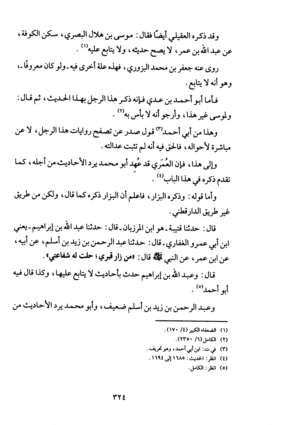 قَالَ: حَدثنَا قُتَيْبَة - هُوَ ابْن الْمَرْزُبَان - قَالَ: حَدثنَا عبد الله بن إِبْرَاهِيم - يَعْنِي ابْن أبي عَمْرو الْغِفَارِيّ - قَالَ: حَدثنَا عبد الرَّحْمَن بن زيد بن أسلم، عَن أَبِيه، عَن ابْن عمر، عَن النَّبِي - صَلَّى اللَّهُ عَلَيْهِ وَسَلَّم َ - قَالَ: " من زار قَبْرِي؛ حلت لَهُ شَفَاعَتِي ".
