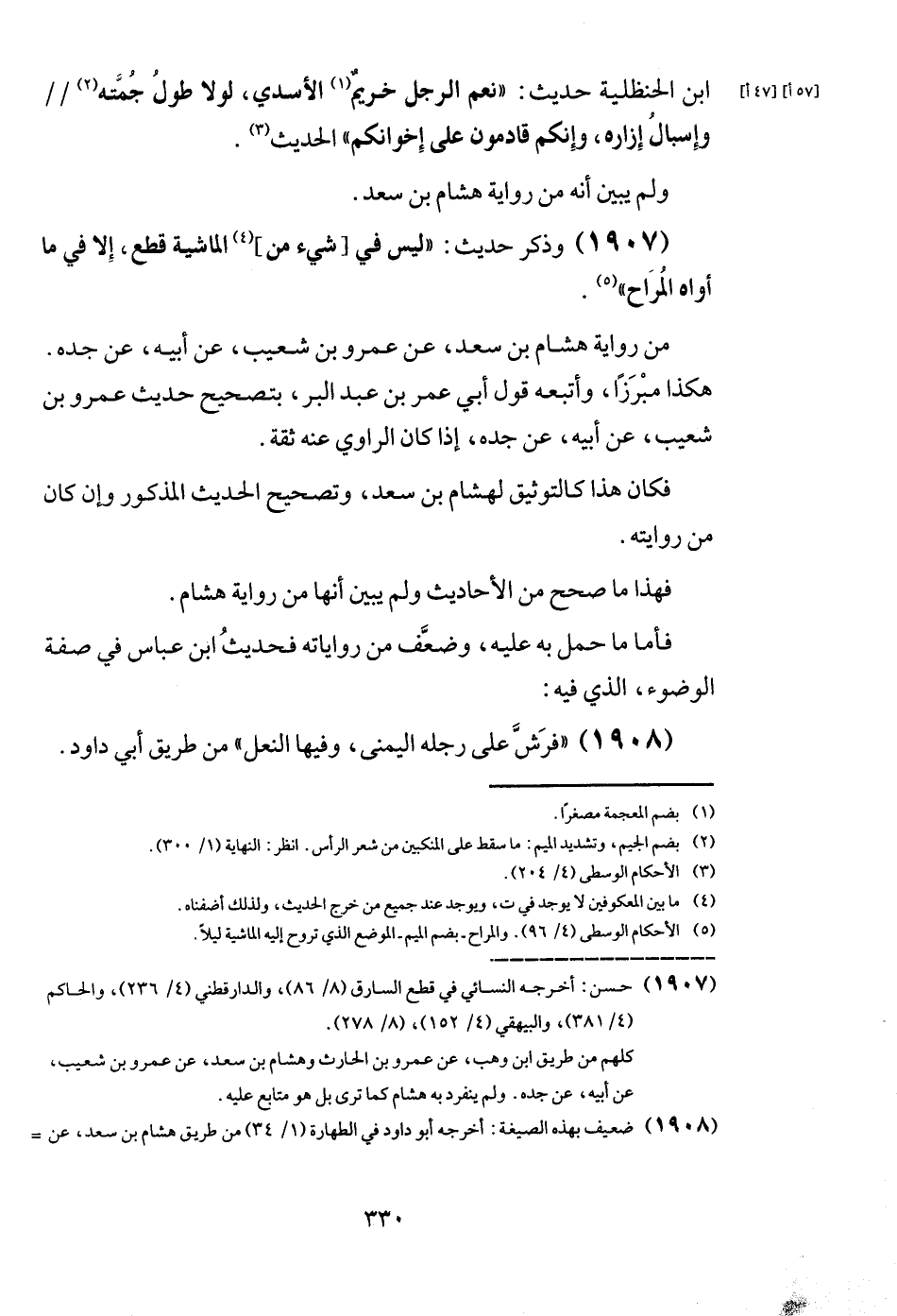 من رِوَايَة هِشَام بن سعد، عَن عَمْرو بن شُعَيْب، عَن أَبِيه، عَن جده. هَكَذَا مبرزا، وأبتعه قَول أبي عمر بن عبد الْبر، بتصحيح حَدِيث عَمْرو بن شُعَيْب، عَن أَبِيه، عَن جده، إِذا كَانَ الرَّاوِي عَنهُ ثِقَة.