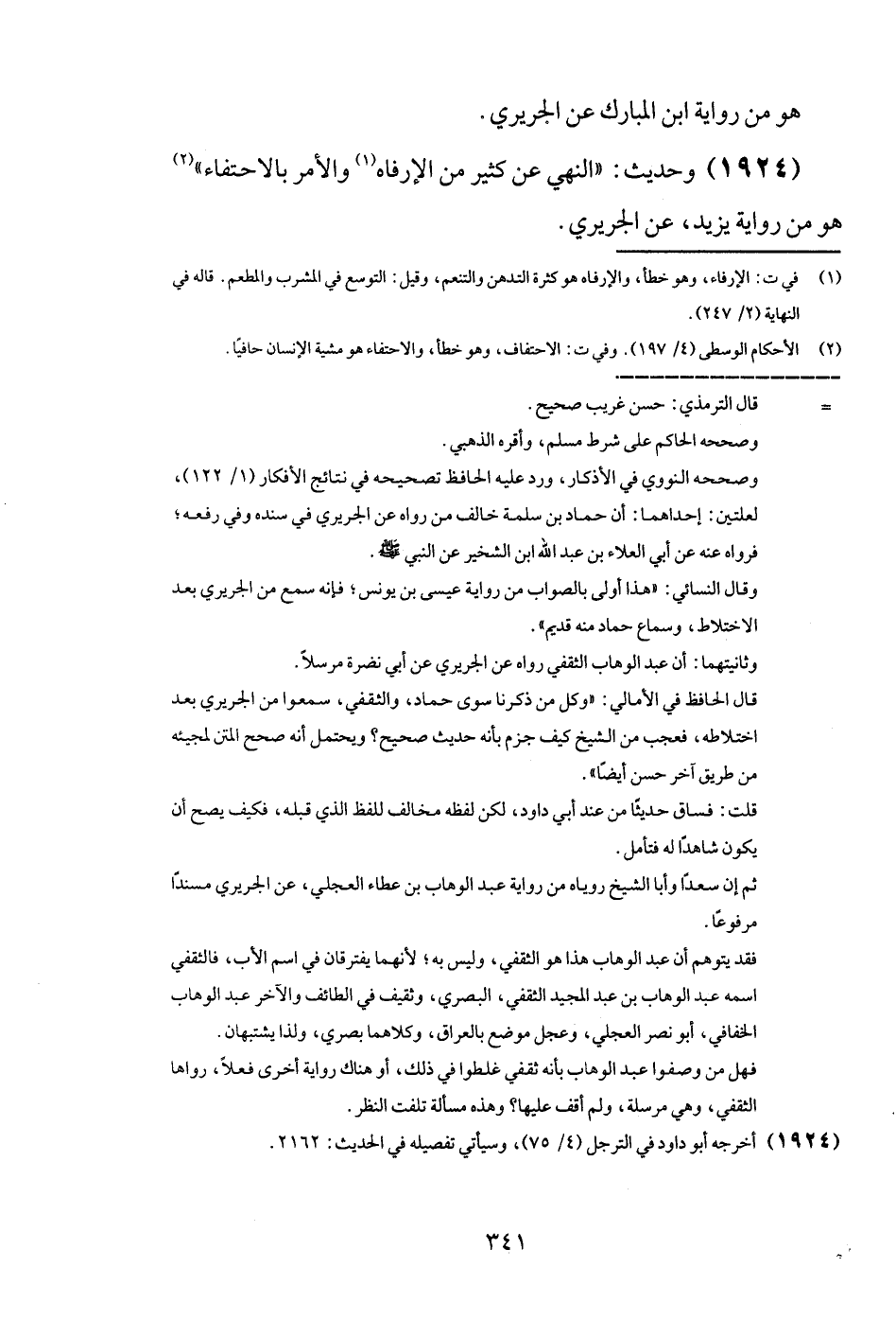 (1924) وَحَدِيث: " النَّهْي عَن كثير من الإرفاه وَالْأَمر بالاحتفاء " هُوَ من رِوَايَة يزِيد، عَن الْجريرِي.