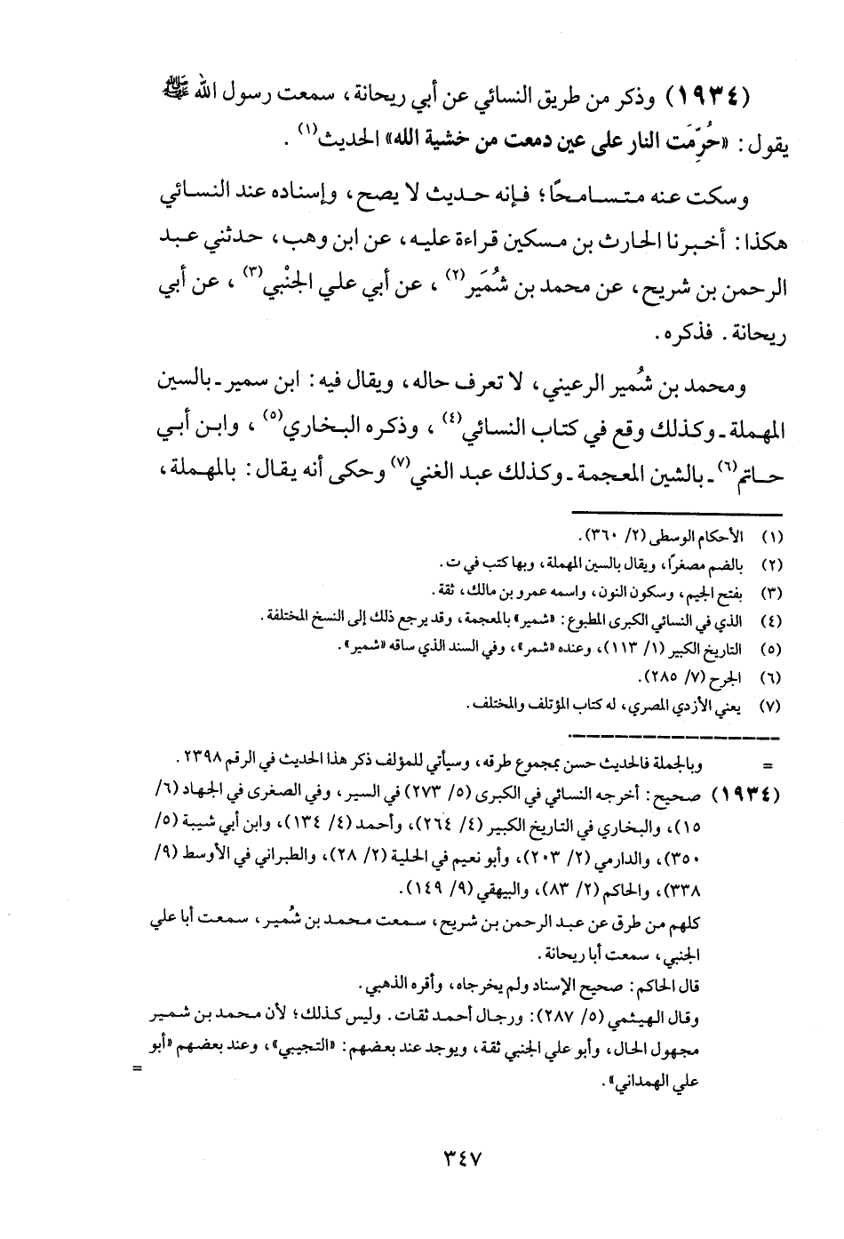 (1934) وَذكر من طَرِيق النَّسَائِيّ عَن أبي رَيْحَانَة، سَمِعت رَسُول الله - صَلَّى اللَّهُ عَلَيْهِ وَسَلَّم َ - يَقُول: " حرمت النَّار على عين دَمَعَتْ من خشيَة الله " الحَدِيث.