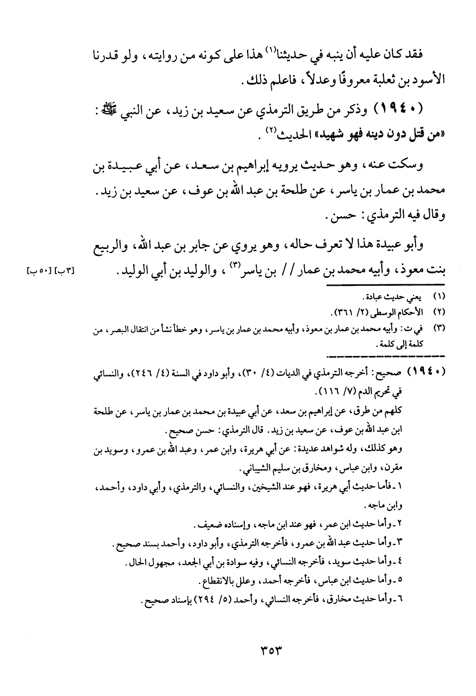 (1940) وَذكر من طَرِيق التِّرْمِذِيّ عَن سعيد بن زيد، عَن النَّبِي - صَلَّى اللَّهُ عَلَيْهِ وَسَلَّم َ -: " من قتل دون دينه فَهُوَ شَهِيد " الحَدِيث.
