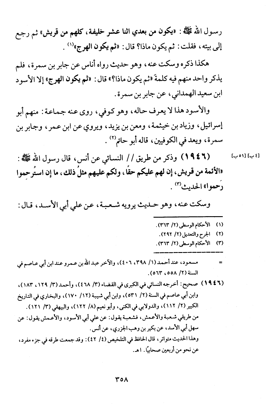 (1946) وَذكر من طَرِيق النَّسَائِيّ عَن أنس، قَالَ رَسُول الله - صَلَّى اللَّهُ عَلَيْهِ وَسَلَّم َ -: " الْأَئِمَّة من قُرَيْش، إِن لَهُم عَلَيْكُم حَقًا، وَلكم عَلَيْهِم مثل ذَلِك، مَا إِن استرحموا رحموا " الحَدِيث.
