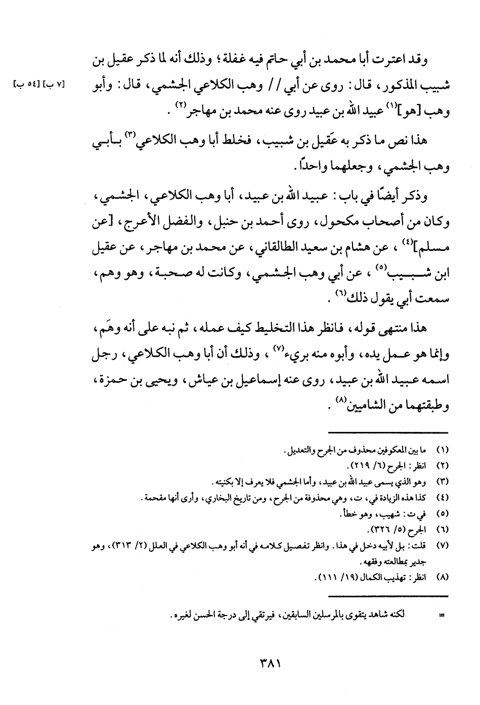 وَقد اعترت أَبَا مُحَمَّد بن أبي حَاتِم فِيهِ غَفلَة؛ وَذَلِكَ أَنه لما ذكر عقيل بن شبيب الْمَذْكُور، قَالَ: روى عَن أبي وهب الكلَاعِي الْجُشَمِي، قَالَ: وَأَبُو وهب [هُوَ] عبيد الله بن عبيد روى عَنهُ مُحَمَّد بن مهَاجر.
