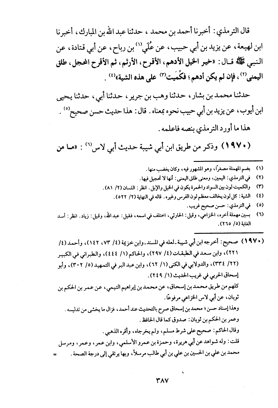 قَالَ التِّرْمِذِيّ: أخبرنَا أَحْمد بن مُحَمَّد، حَدثنَا عبد الله بن الْمُبَارك، أخبرنَا ابْن لَهِيعَة، عَن يزِيد بن أبي حبيب، عَن عَليّ بن رَبَاح، عَن أبي قَتَادَة، عَن النَّبِي - صَلَّى اللَّهُ عَلَيْهِ وَسَلَّم َ - قَالَ: " خير الْخَيل الأدهم، الأقرح، الأرثم، ثمَّ الأقرح المحجل، طلق الْيُمْنَى، فَإِن لم يكن أدهم؛ فكميت على هَذِه الشية ".