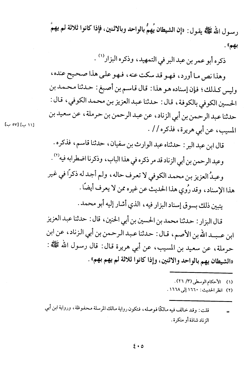 قَالَ الْبَزَّار: حَدثنَا مُحَمَّد بن الْحُسَيْن بن أبي الحنين، قَالَ: حَدثنَا عبد الْعَزِيز ابْن عبد الله بن الْأَصَم، قَالَ: حَدثنَا عبد الرَّحْمَن بن أبي الزِّنَاد، عَن ابْن حَرْمَلَة، عَن سعيد بن الْمسيب، عَن أبي هُرَيْرَة قَالَ: قَالَ رَسُول الله - صَلَّى اللَّهُ عَلَيْهِ وَسَلَّم َ -: " الشَّيْطَان يهم بِالْوَاحِدِ والاثنين، وَإِذا كَانُوا ثَلَاثَة لَا يهم بهم ".