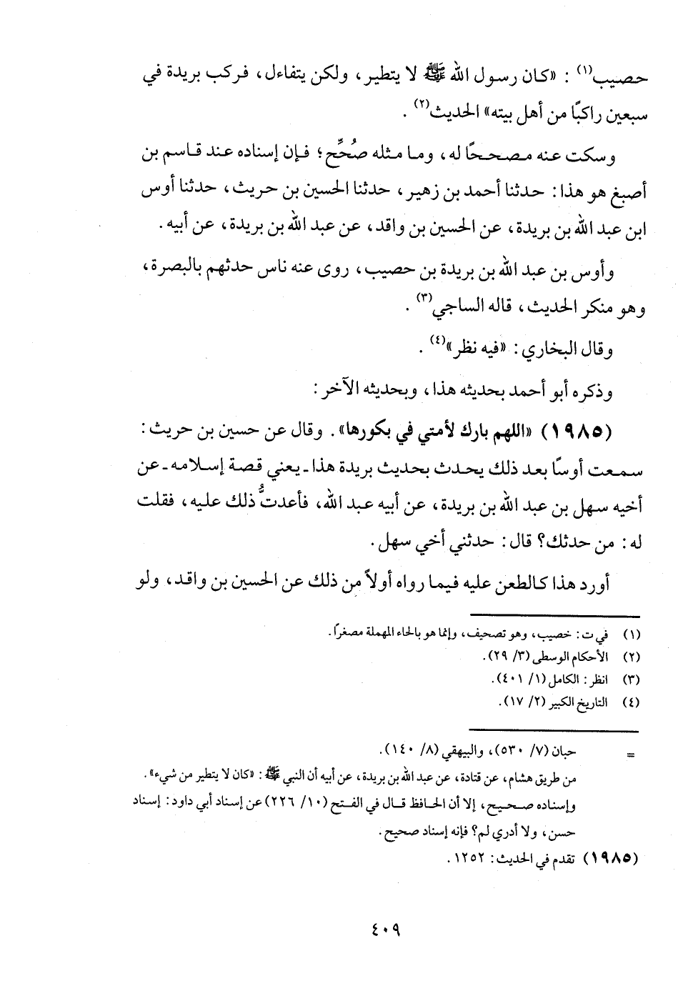 (1985) " اللَّهُمَّ بَارك لأمتي فِي بكورها ". وَقَالَ عَن حُسَيْن بن حُرَيْث: سَمِعت أَوْسًا بعد ذَلِك يحدث بِحَدِيث بُرَيْدَة هَذَا - يَعْنِي قصَّة إِسْلَامه - عَن أَخِيه سهل بن عبد الله بن بُرَيْدَة، عَن أَبِيه عبد الله، فَأَعَدْت ذَلِك عَلَيْهِ، فَقلت لَهُ: من حَدثَك؟ قَالَ: حَدثنِي أخي سهل.