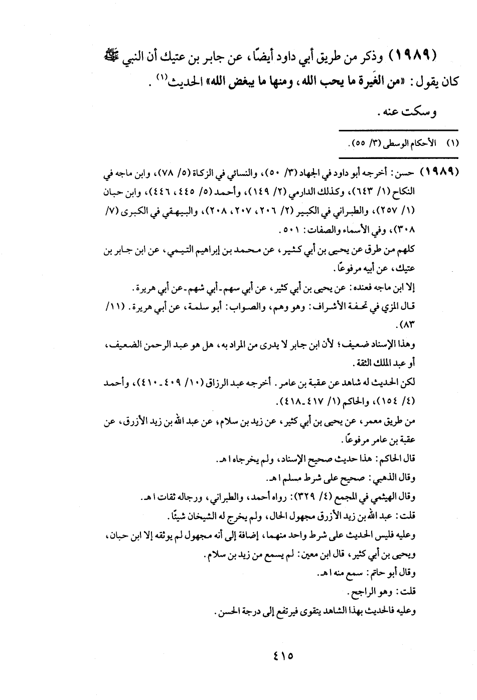 (1989) وَذكر من طَرِيق أبي دَاوُد أَيْضا، عَن جَابر بن عتِيك أَن النَّبِي - صَلَّى اللَّهُ عَلَيْهِ وَسَلَّم َ - كَانَ يَقُول: " من الْغيرَة مَا يحب الله، وَمِنْهَا مَا يبغض الله " الحَدِيث.