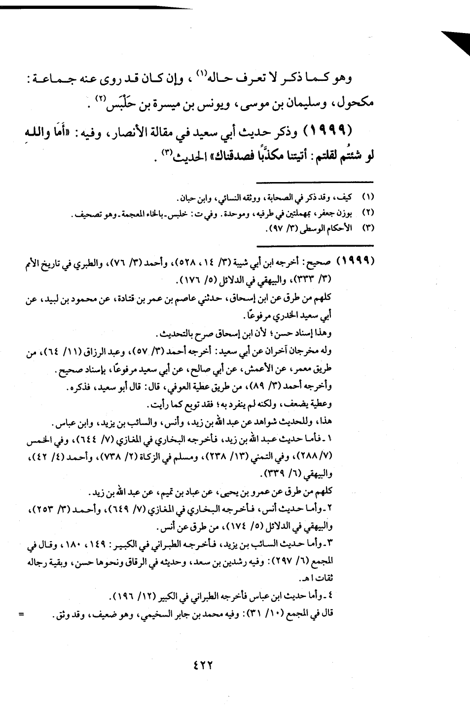 (1999) وَذكر حَدِيث أبي سعيد فِي مقَالَة الْأَنْصَار، وَفِيه: " أما وَالله لَو شِئْتُم لقلتم: أَتَيْتنَا مُكَذبا فَصَدَّقْنَاك " الحَدِيث.