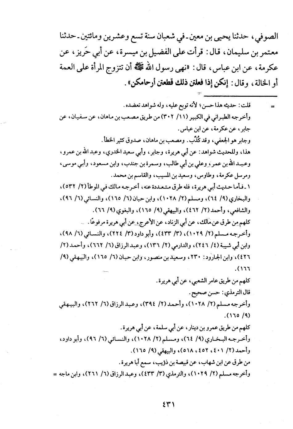 الصُّوفِي، حَدثنَا يحيى بن معِين - فِي شعْبَان سنة تسع وَعشْرين وَمِائَتَيْنِ - حَدثنَا مُعْتَمر بن سُلَيْمَان، قَالَ: قَرَأت على الفضيل بن ميسرَة، عَن أبي حريز، عَن عِكْرِمَة، عَن ابْن عَبَّاس، قَالَ: " نهى رَسُول الله - صَلَّى اللَّهُ عَلَيْهِ وَسَلَّم َ - أَن تتَزَوَّج الْمَرْأَة على الْعمة أَو الْخَالَة، وَقَالَ: إنكن إِذا فعلتن ذَلِك قطعتن أرحامكن ".