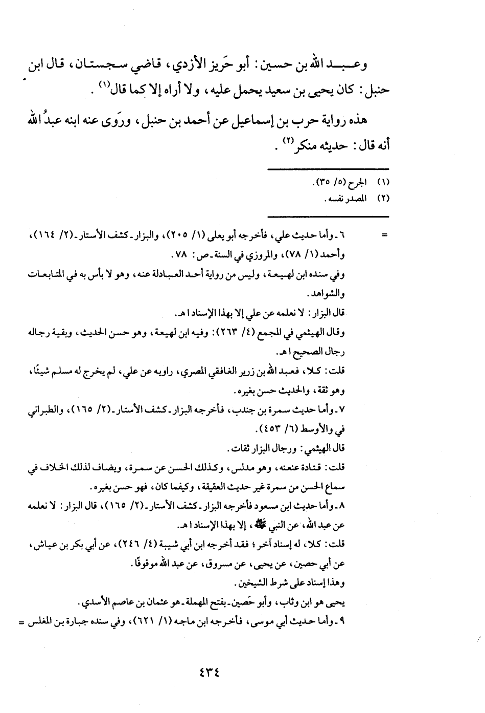 وَعبد الله بن حُسَيْن: أَبُو حريز الْأَزْدِيّ، قَاضِي سجستان، قَالَ ابْن حَنْبَل: كَانَ يحيى بن سعيد يحمل عَلَيْهِ، وَلَا أرَاهُ إِلَّا كَمَا قَالَ.
