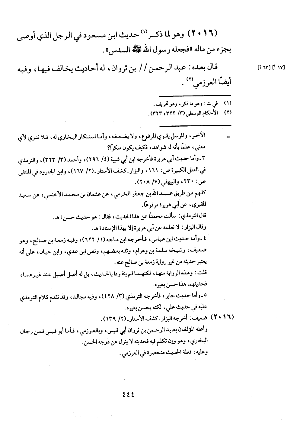 (2016) وَهُوَ لما ذكر حَدِيث ابْن مَسْعُود فِي الرجل الَّذِي أوصى بِجُزْء من مَاله " فَجعله رَسُول الله - صَلَّى اللَّهُ عَلَيْهِ وَسَلَّم َ - السُّدس ".