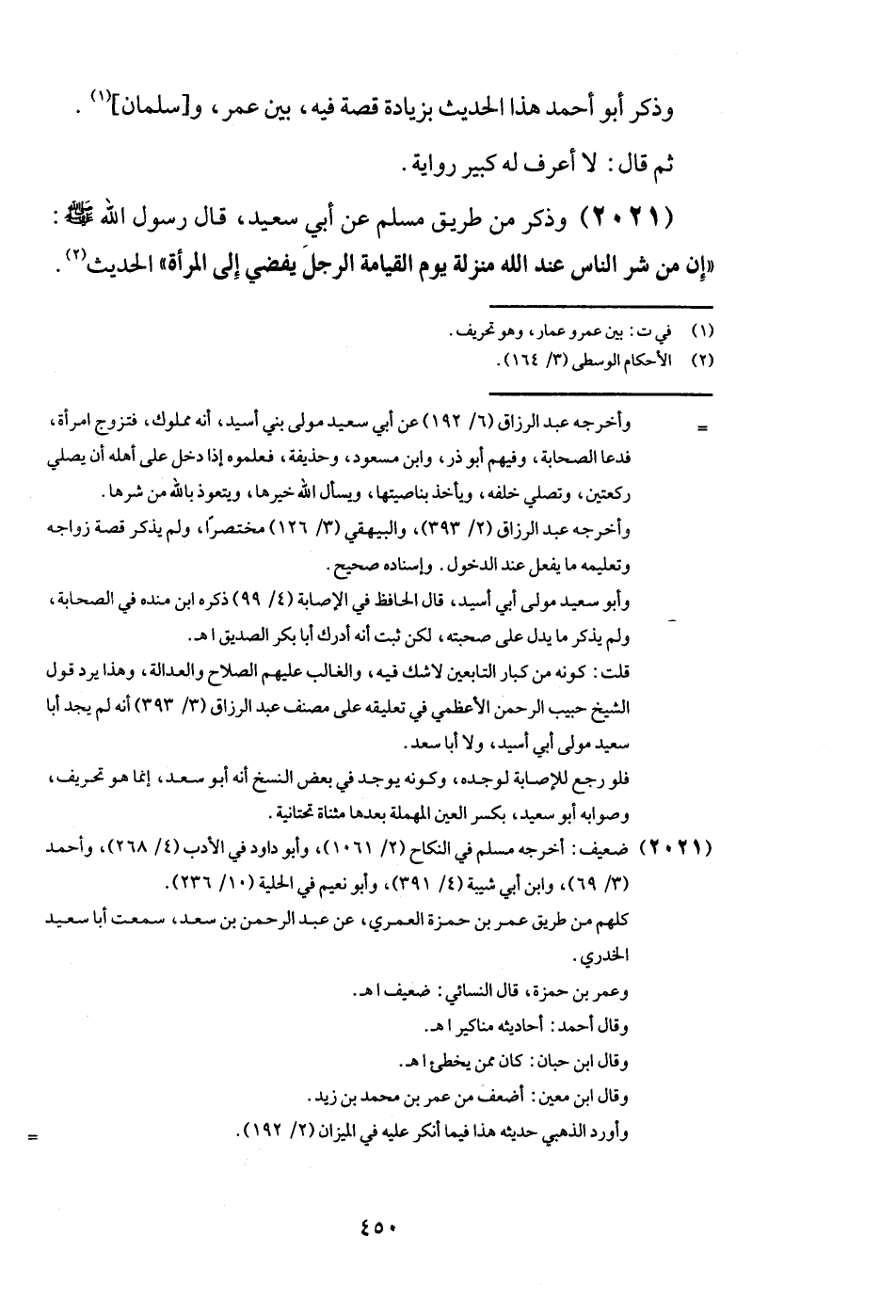 (2021) وَذكر من طَرِيق مُسلم عَن أبي سعيد، قَالَ رَسُول الله - صَلَّى اللَّهُ عَلَيْهِ وَسَلَّم َ -: " إِن من شَرّ النَّاس عِنْد الله منزلَة يَوْم الْقِيَامَة الرجل يُفْضِي إِلَى الْمَرْأَة " الحَدِيث.