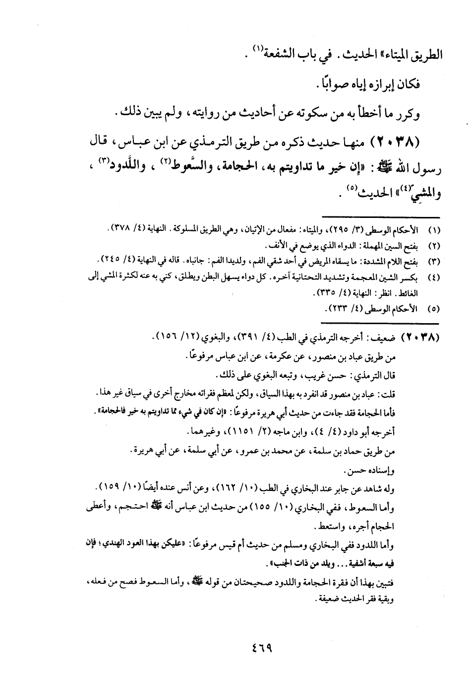 (2038) مِنْهَا حَدِيث ذكره من طَرِيق التِّرْمِذِيّ عَن ابْن عَبَّاس، قَالَ رَسُول الله - صَلَّى اللَّهُ عَلَيْهِ وَسَلَّم َ -: " إِن خير مَا تدوايتم بِهِ، الْحجامَة، والسعوط، واللدود، وَالْمَشْي " الحَدِيث.