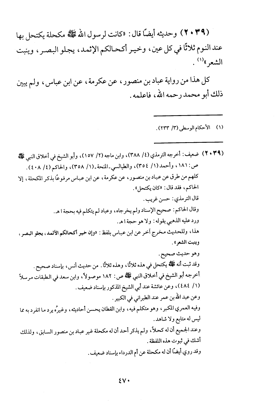 (2039) وَحَدِيثه أَيْضا قَالَ: " كَانَت لرَسُول الله - صَلَّى اللَّهُ عَلَيْهِ وَسَلَّم َ - مكحلة يكتحل بهَا عِنْد النّوم ثَلَاثًا فِي كل عين، وَخير أكحالكم الإثمد، يجلو الْبَصَر، وينبت الشّعْر ".
