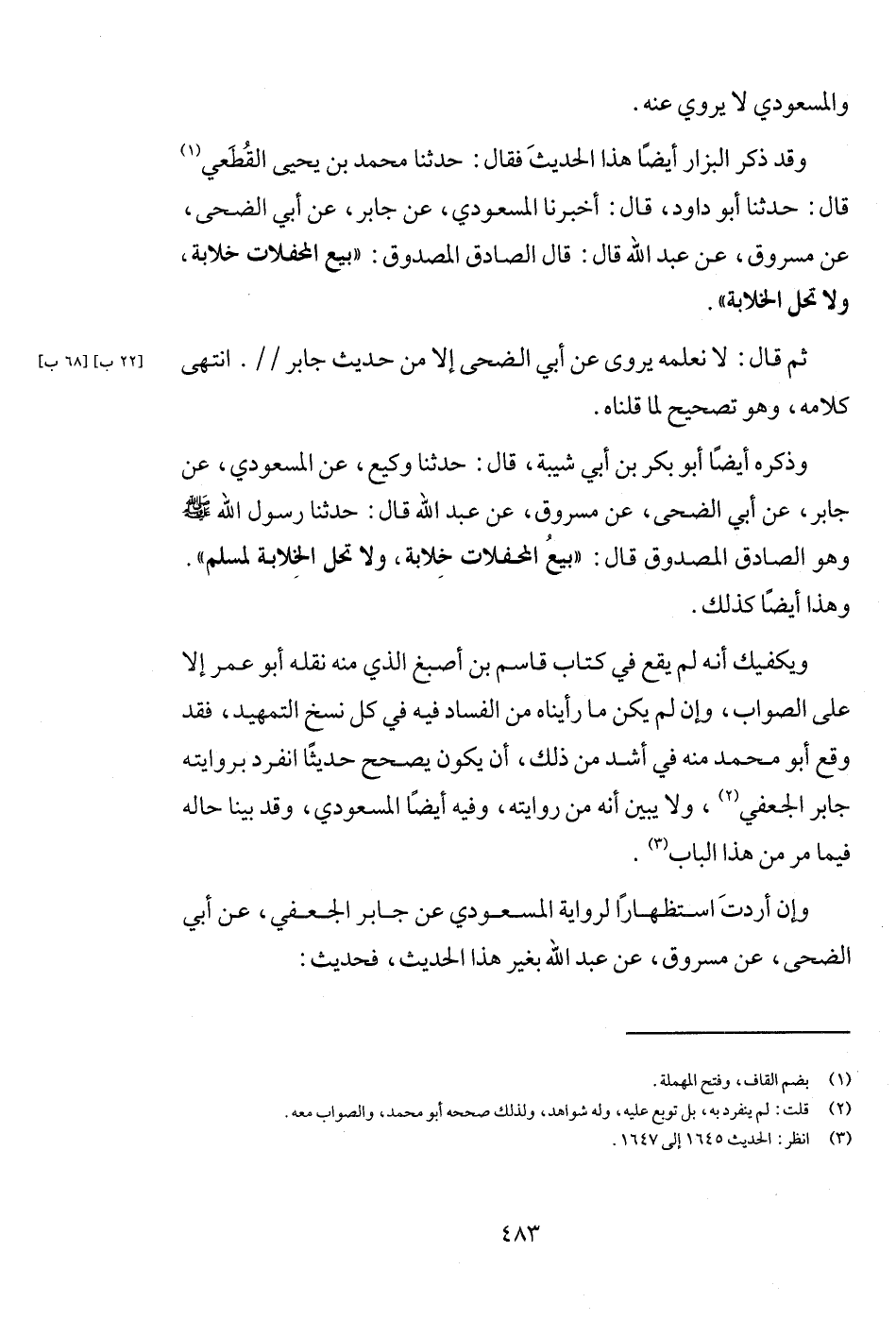 وَيَكْفِيك أَنه لم يَقع فِي كتاب قَاسم بن أصبغ الَّذِي مِنْهُ نَقله أَبُو عمر إِلَّا على الصَّوَاب، وَإِن لم يكن مَا رَأَيْنَاهُ من الْفساد فِيهِ فِي كل نسخ التَّمْهِيد، فقد وَقع أَبُو مُحَمَّد مِنْهُ فِي أَشد من ذَلِك، أَن يكون يصحح حَدِيثا انْفَرد بروايته جَابر الْجعْفِيّ، وَلَا يبين أَنه من رِوَايَته، وَفِيه أَيْضا المَسْعُودِيّ، وَقد بَينا حَاله فِيمَا مر من هَذَا الْبَاب.