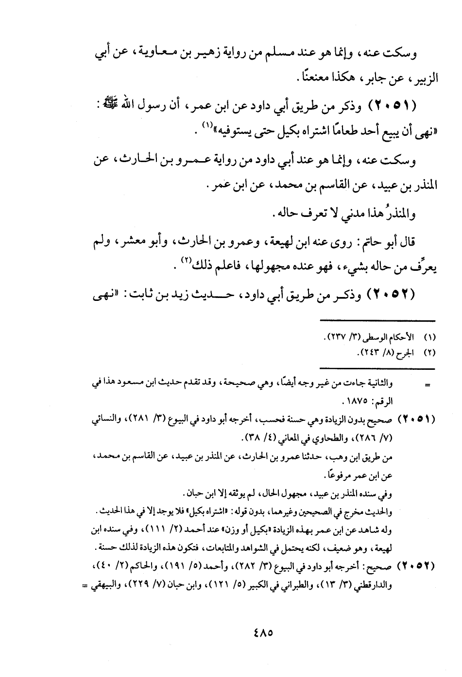 (2051) وَذكر من طَرِيق أبي دَاوُد عَن ابْن عمر، أَن رَسُول الله - صَلَّى اللَّهُ عَلَيْهِ وَسَلَّم َ -: " نهى أَن يَبِيع أحد طَعَاما اشْتَرَاهُ بكيل حَتَّى يَسْتَوْفِيه ".