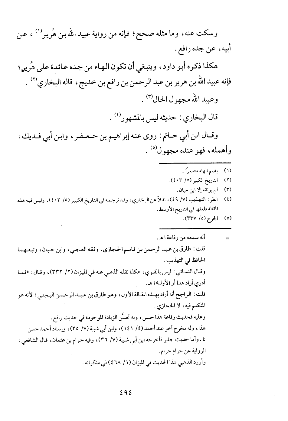هَكَذَا ذكره أَبُو دَاوُد، وَيَنْبَغِي أَن تكون الْهَاء من جده عَائِدَة على هرير؛ فَإِنَّهُ عبيد الله بن هرير بن عبد الرَّحْمَن بن رَافع بن خديج، قَالَه البُخَارِيّ.
