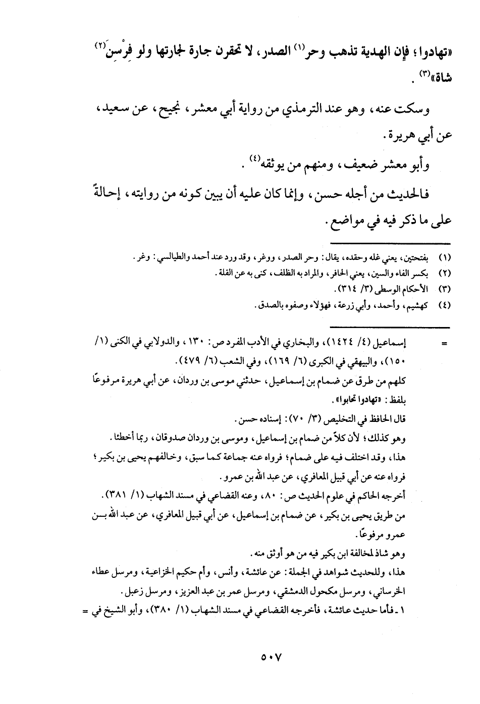 " تهادوا؛ فَإِن الْهَدِيَّة تذْهب وحر الصَّدْر، لَا تحقرن جَارة لجارتها وَلَو فرسن شَاة ".
